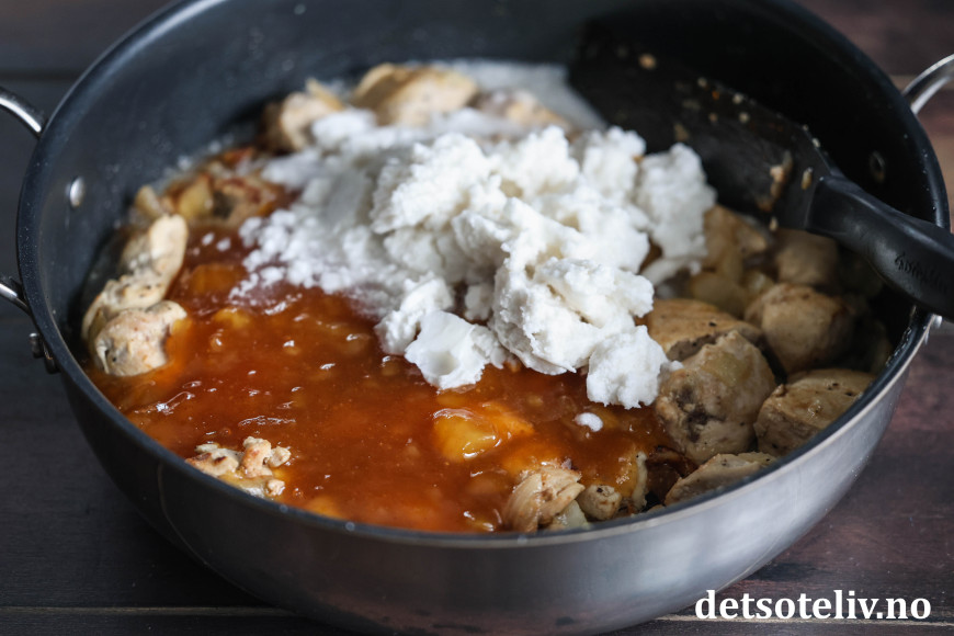 Tilsett mangochutney og kokosmelk. Tilsett kremfløte og krydderet (curry powder og gurkemeie).