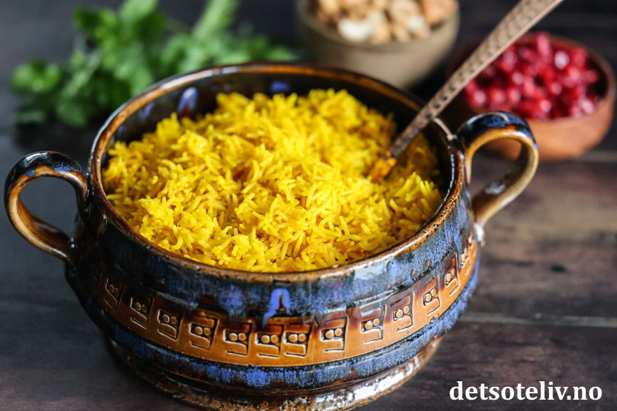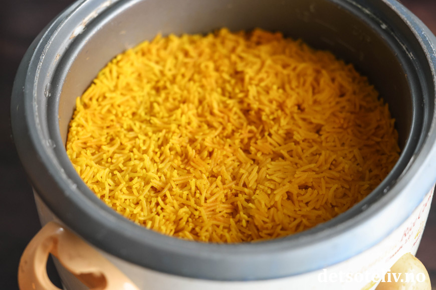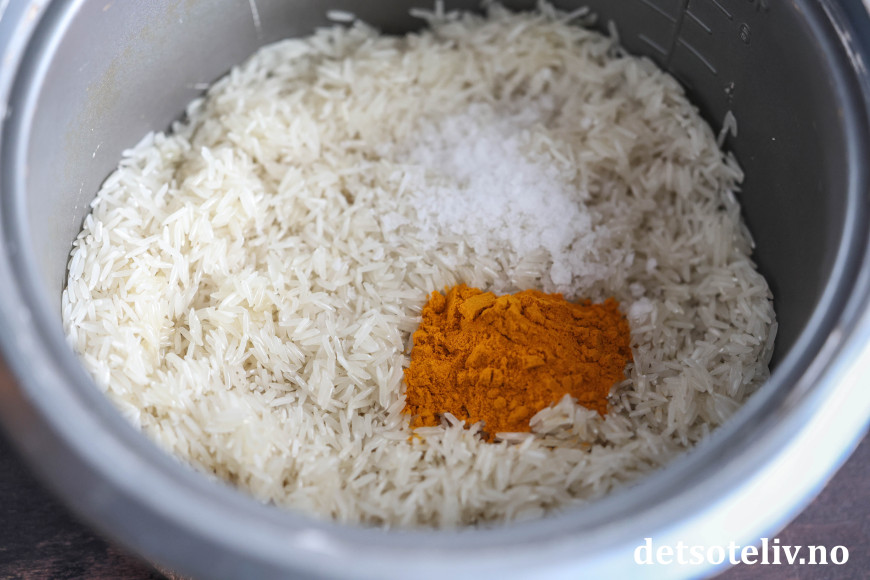 Ha ris, olje, salt og gurkemeie i en riskoker (eller kjele hvis du bruker det).