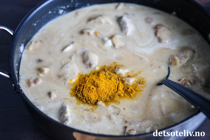 Tilsett kremfløte og krydderet (curry powder og gurkemeie).