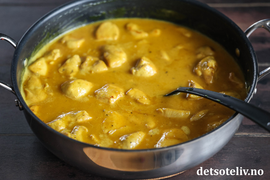 Bland godt sammen og la curryen småkoke i ca. 10 minutter, slik at kyllingbitene blir helt møre.