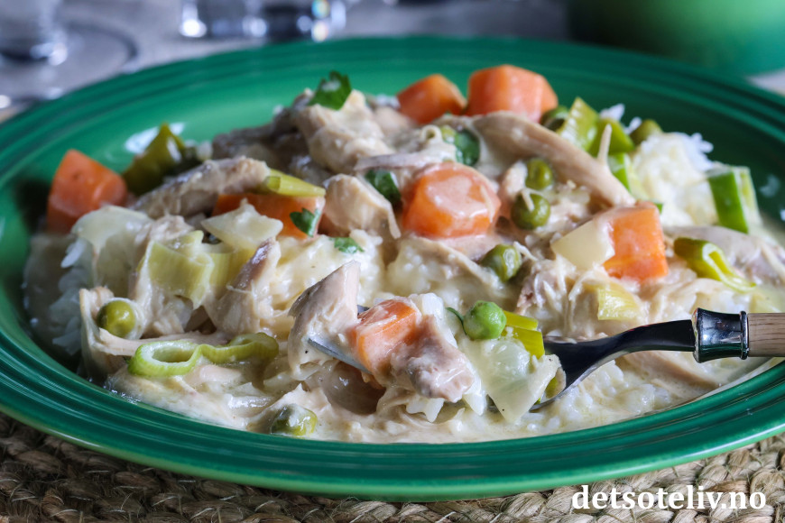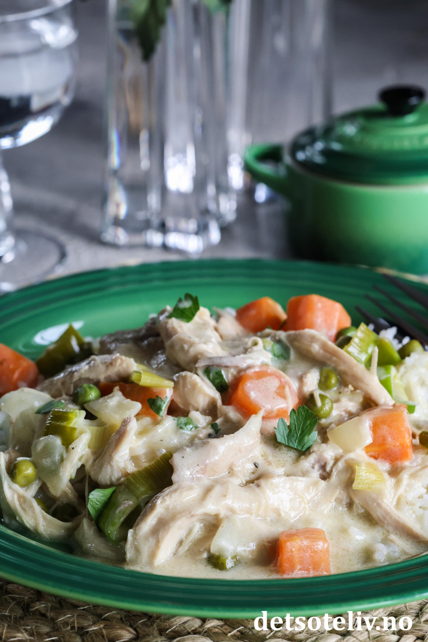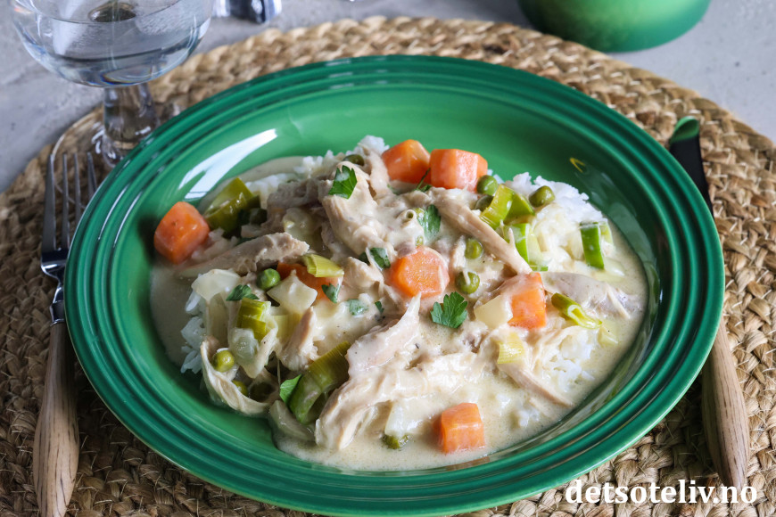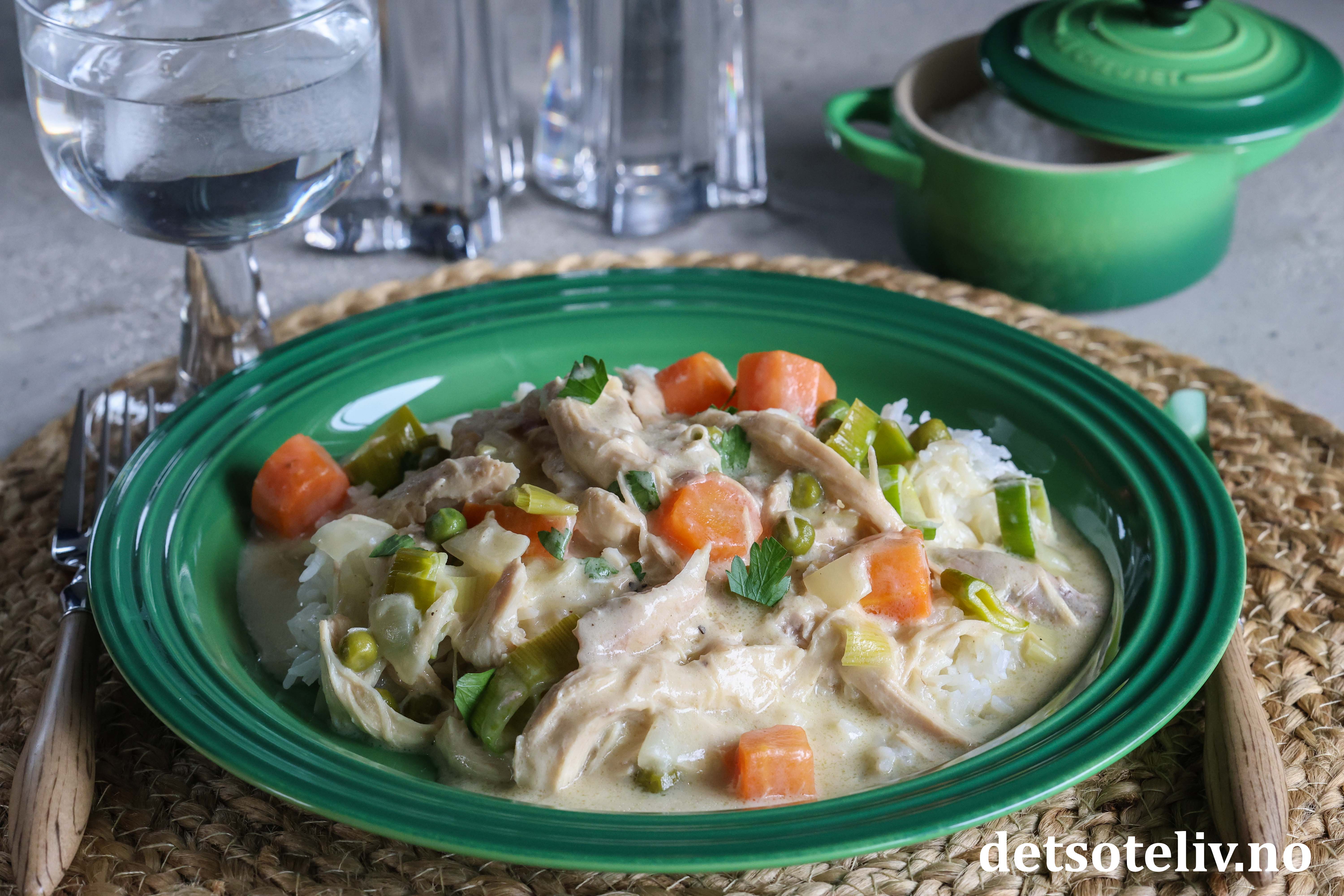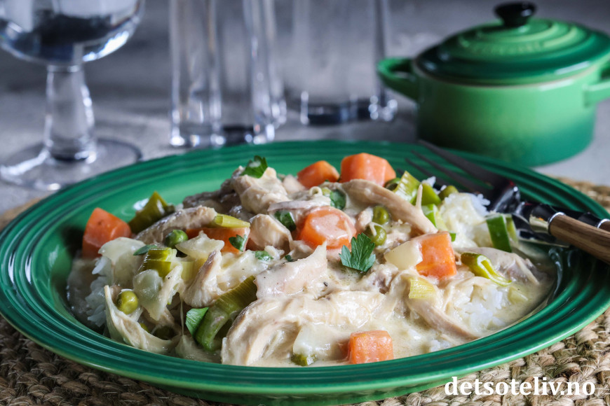 Kyllingfrikassé har mild og god smak som alle liker! 😊