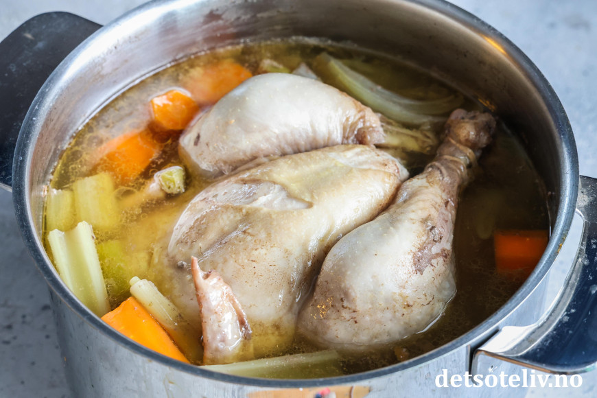 ♥ Det er viktig at kyllingen ikke koker for kraftig, for da vil kyllingkjøttet avgi væske og bli tørt. Bruk heller lavere varme og lengre tid. Kyllingen skal bare småputre i 2 timer for at kyllingkjøttet skal bevare saftigheten mest mulig.