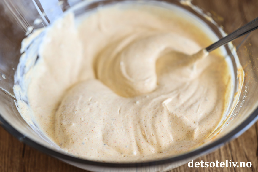 Rør sammen ingrediensene til dressingen. Smak til og juster med litt ekstra krydder eller rømme alt ettersom hvor sterk smak du liker.