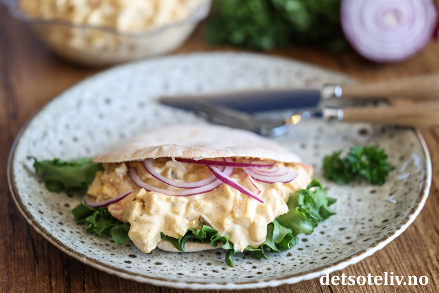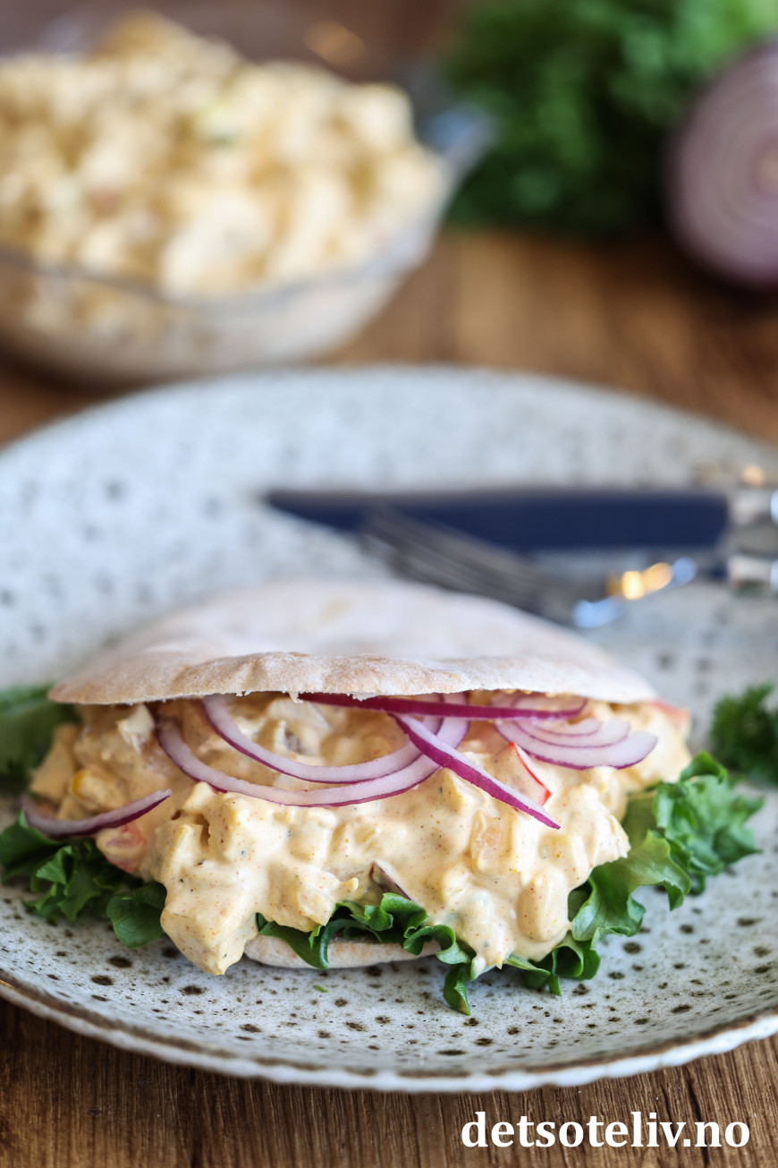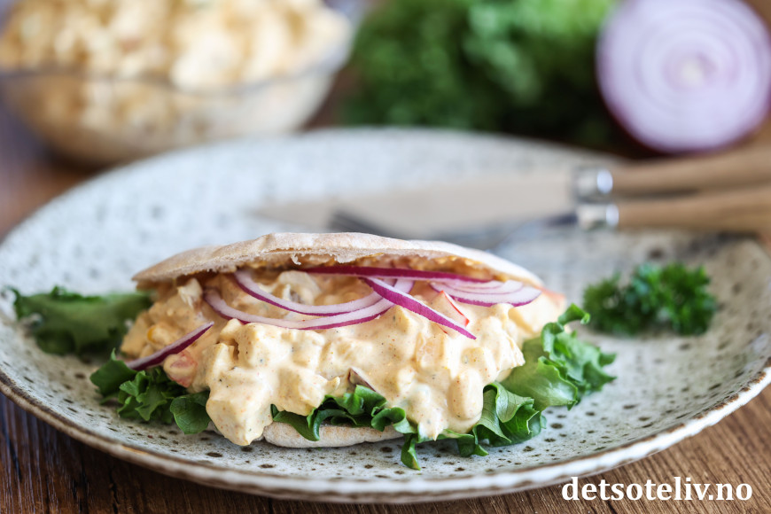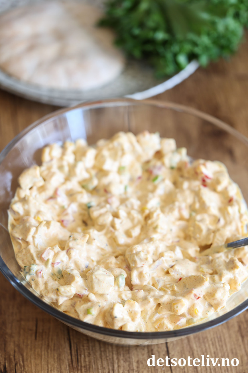 Kyllingsalaten er deilig å legge på toast eller fylle i wrap, baguette, sandwich eller pitabrød.