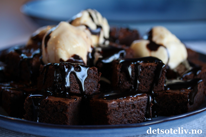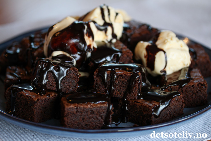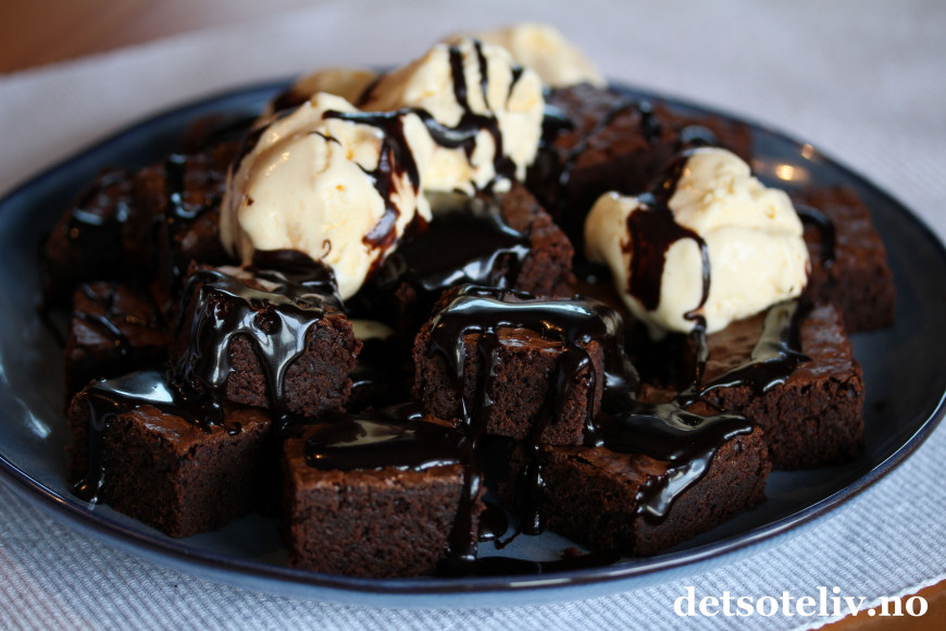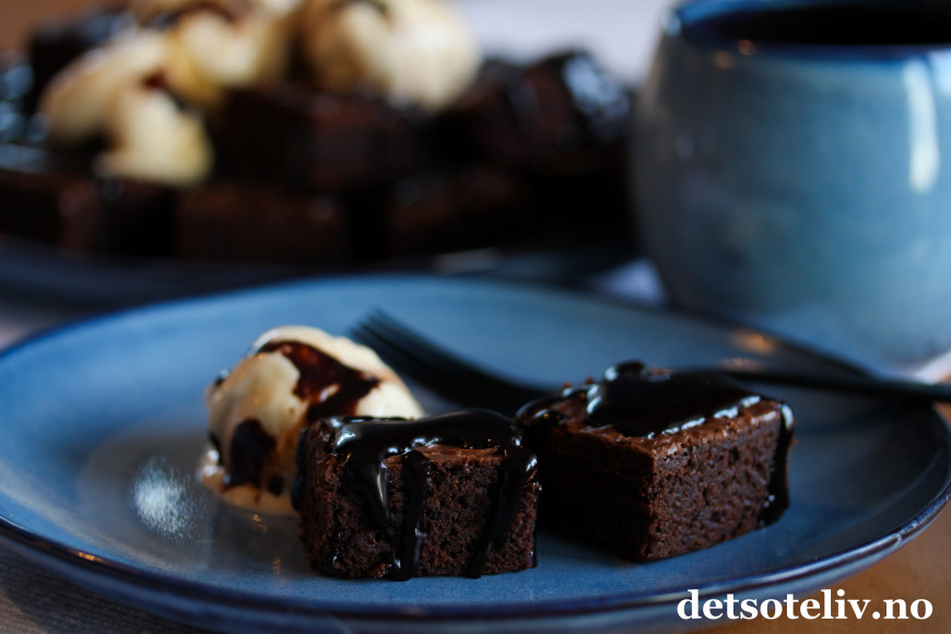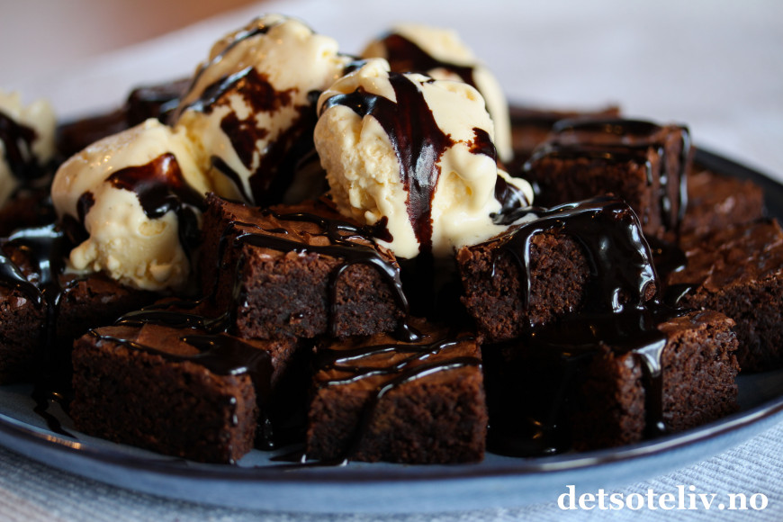 ♥ Siden iskremen selvfølgelig smelter etter hvert, særlig hvis du bruker varm lakrissaus, bør du legge iskrem og saus oppå browniesene rett før servering.