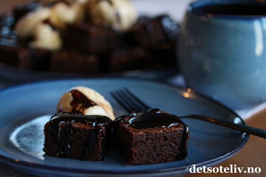 ♥ Både lakrisbrownies og lakrissirup kan lages klar i forkant og oppbevares et par dager i kjøleskapet. Varm da opp lakrissausen igjen før servering. Browniesene er dessuten kjempefine å fryse.