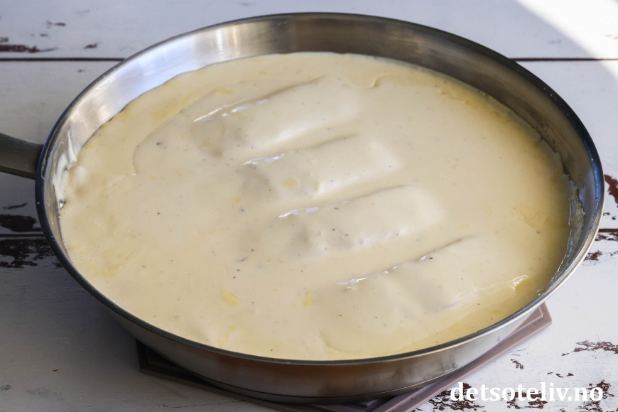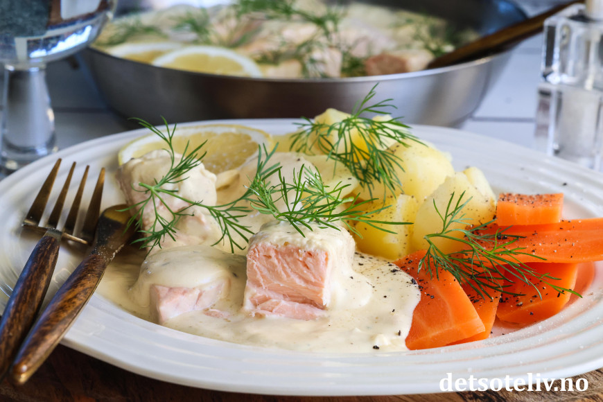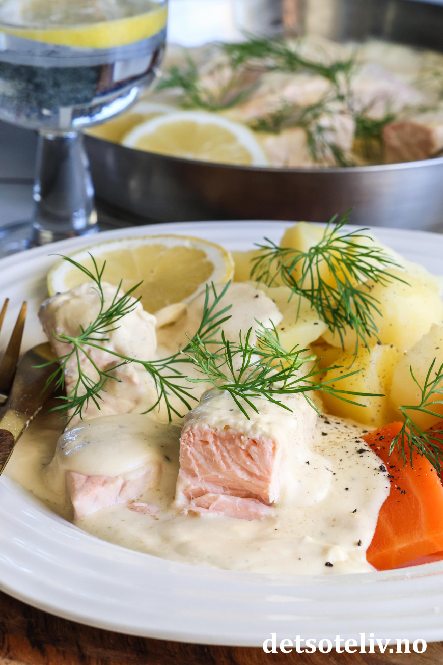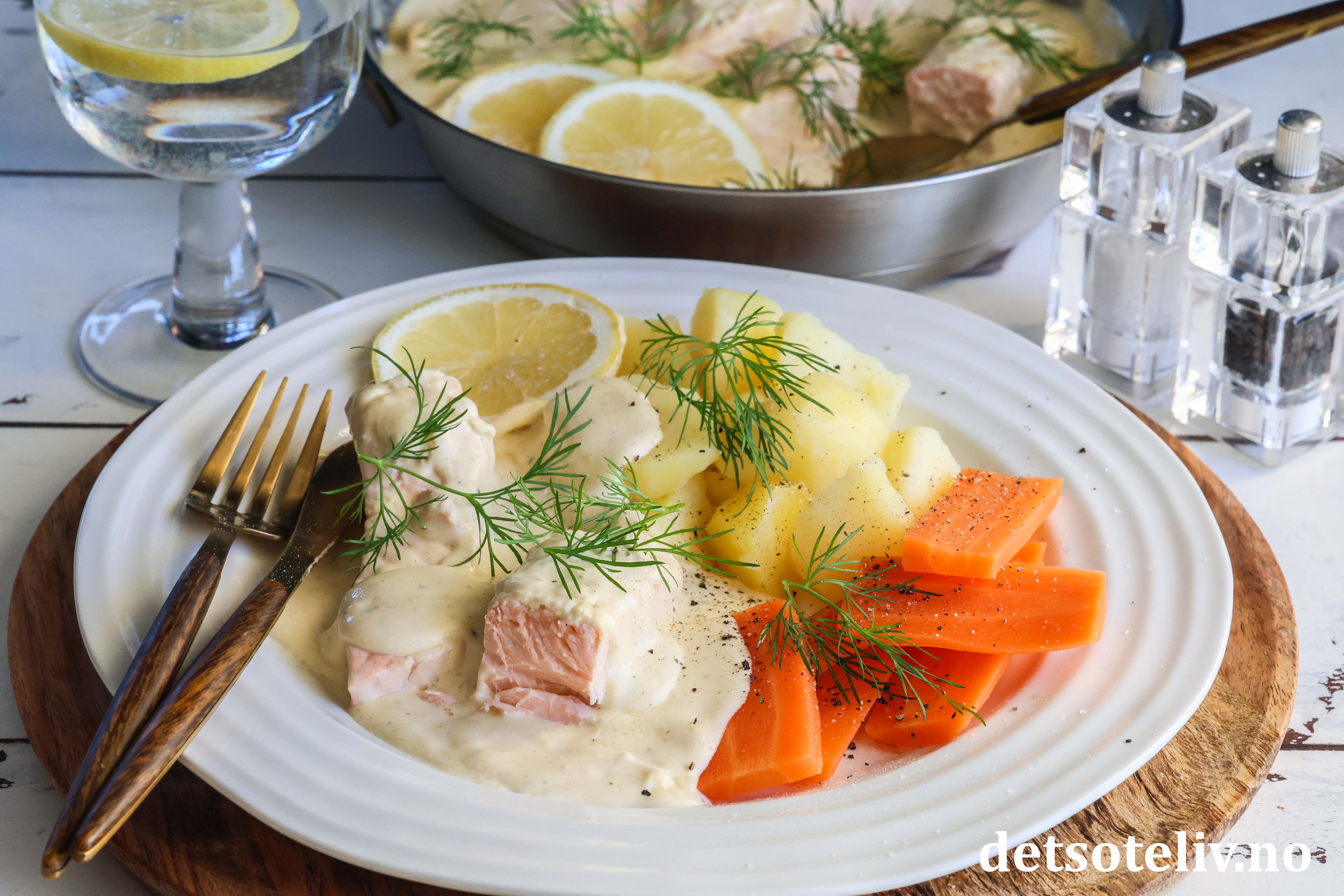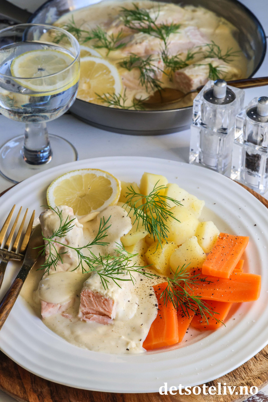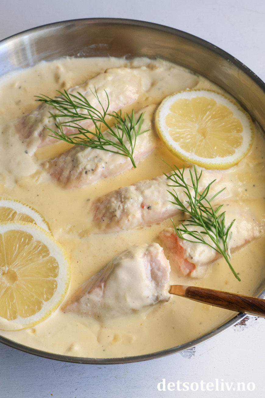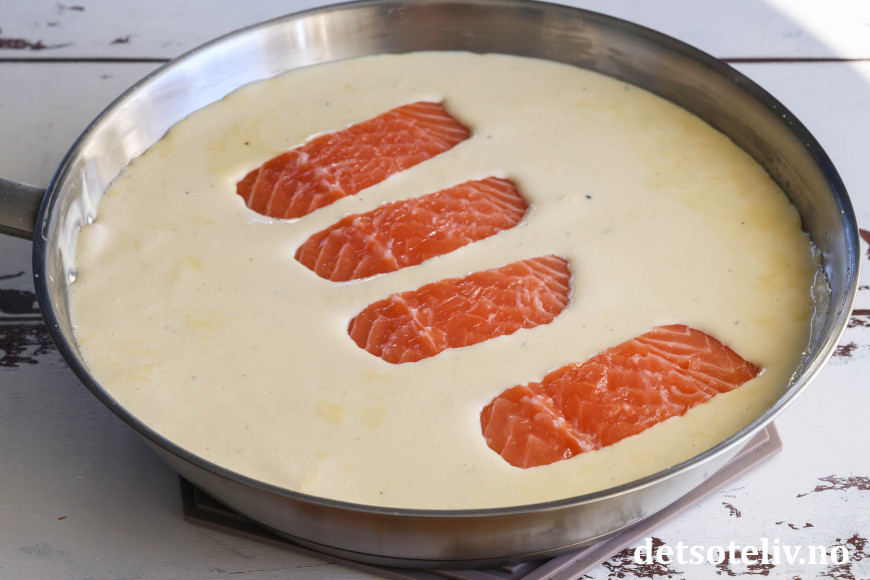 Sett pannen tilbake på platen og sett nå lokk på pannen. La laksen varmes i sausen på middels varme til den er gjennomkokt, ca. 10 minutter.