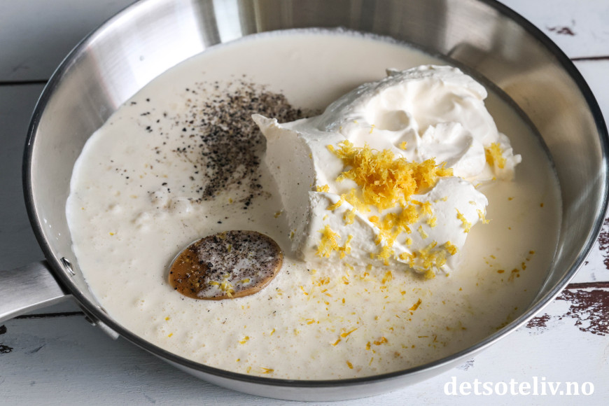 Ha crème fraîche og fløte i en stekepanne. Tilsett fint revet skall og presset saft fra sitronen. Ha også kyllingfond i pannen. Kvern over salt og pepper.