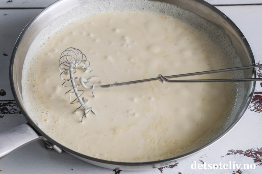 Varm opp på middels varme og la sausen småkoke i ca. 5 minutter. Smak til sausen om det trengs litt mer salt og pepper.