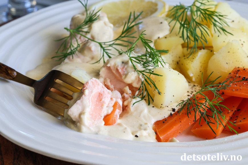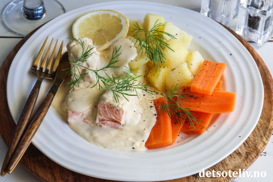 Kokte poteter og gulrøtter er enkelt tilbehør, men passer veldig bra til.