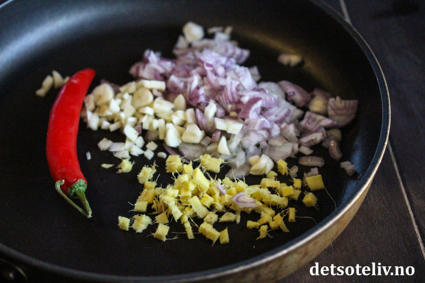 Finhakk sjalottløk, hvitløk, ingefær og chili og ha dette i en stekepanne.