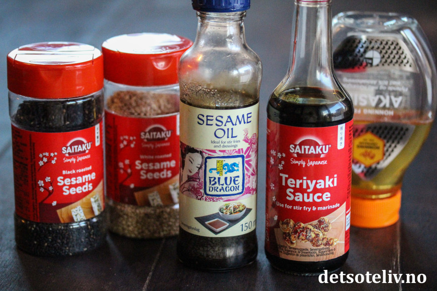 ♥ Jeg har her brukt ferdigkjøpt teriyakisaus som base, men tilsetter altså ekstra sukker, honning og maisenna for å gjøre sausen søtere og tykkere. Det gjør at sausen legger seg rundt laksebitene som en tykk glasur ("glaze").