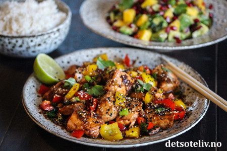 Serveres her med ris og Mango- og avokadosalat.