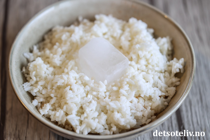 ♥ Du kan også bruke rester av kokt ris, men det bør være jasminris eller sushiris (som godt kan være smaksatt med sukker og riseddik, se innlegg om Sushiris). Rester av kokt ris bør dekkes til med plast og oppbevares i kjøleskapet til dagen etter. Risen vil bli tørrere dagen etter. Et godt tips for å få rester av kokt ris til å bli bra igjen er å ha risen i en skål, legge en isbit oppå risen og dekke over med bakepapir og sett i mikrobølgeovnen i 1 - 2 minutter. Det gjør underverker med risen! 😊