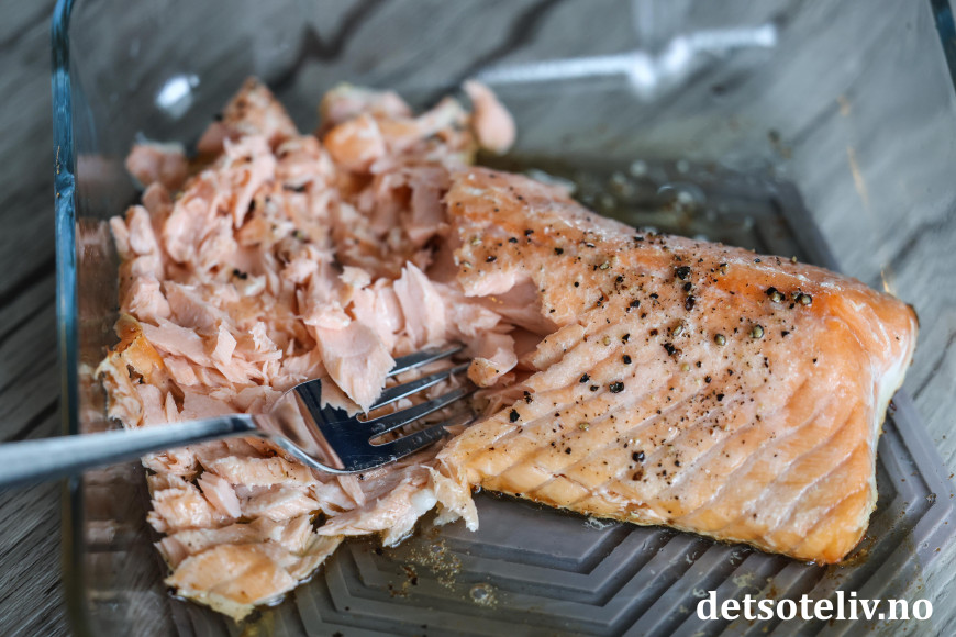 ♥ Jeg har her brukt et stykke laksefilet (midloin) som jeg har bakt i ovnen for å lage denne retten, men har du rester av ferdigkokt laks igjen fra middagen, kan du gjerne bruke disse. I stedet for kokt eller ovnsbakt laks, kan du bruke varmrøkt laks.