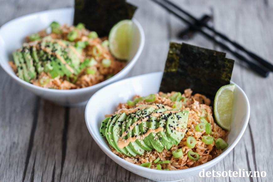 Laks- og risblandingen has i en skål og toppes med avokado, vårløk, et dryss sesamfrø og kanskje litt lime. Serveres gjerne med noriark, som er klippet i mindre biter.