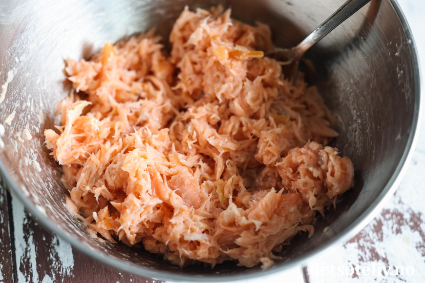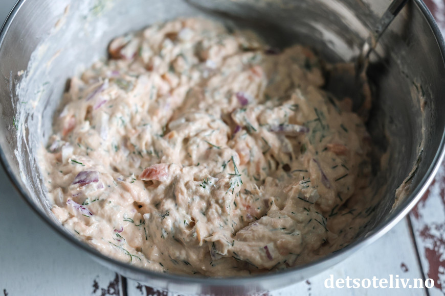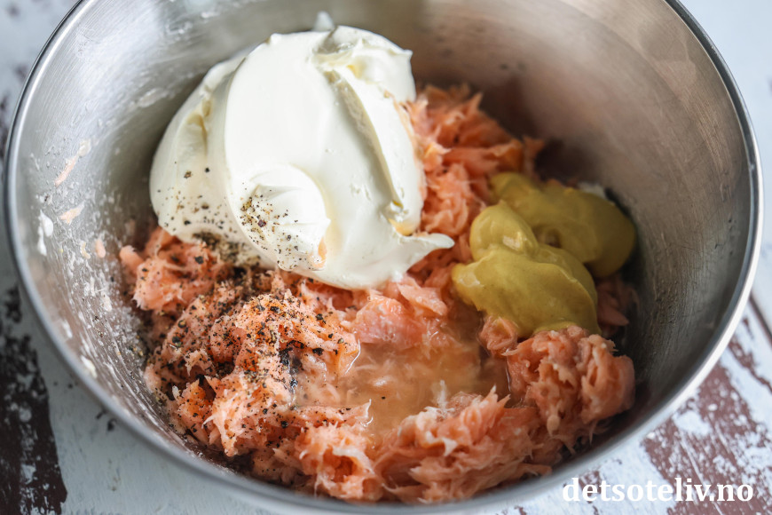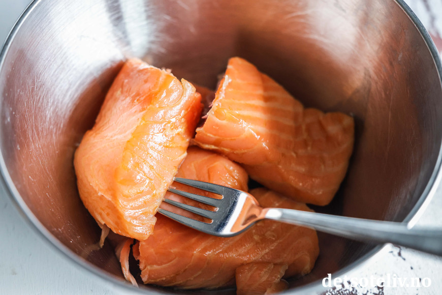 Ha varmrøkt laks i en bolle og mos den opp med en gaffel.