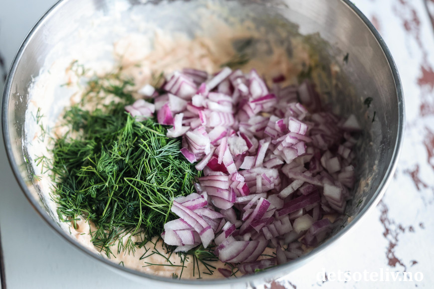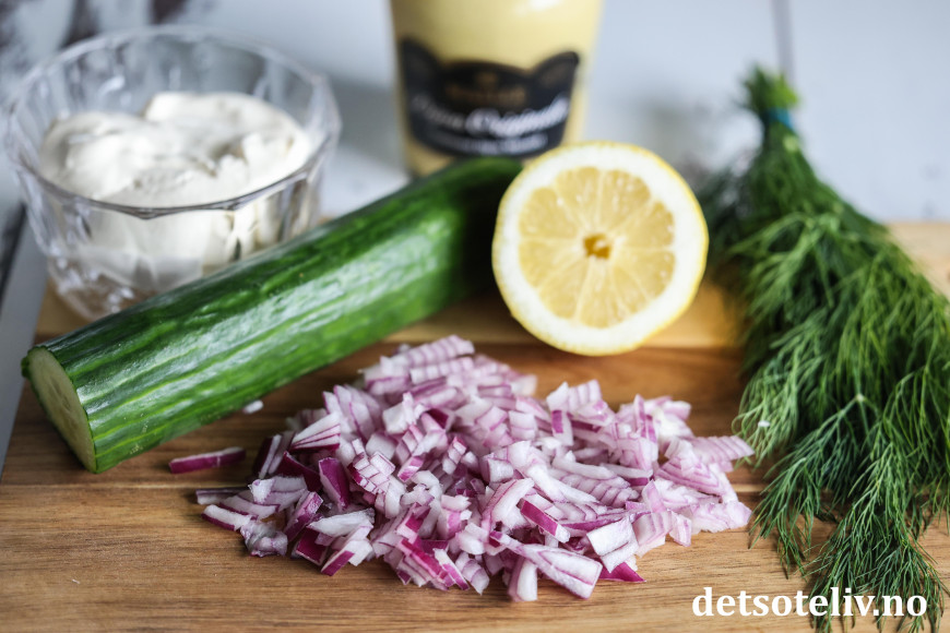 Tilsett crème fraîche, dijonsennep, presset sitronsaft og kvernet salt og pepper. Rør sammen og tilsett finhakket rødløk og dill.