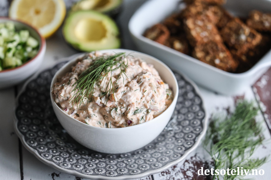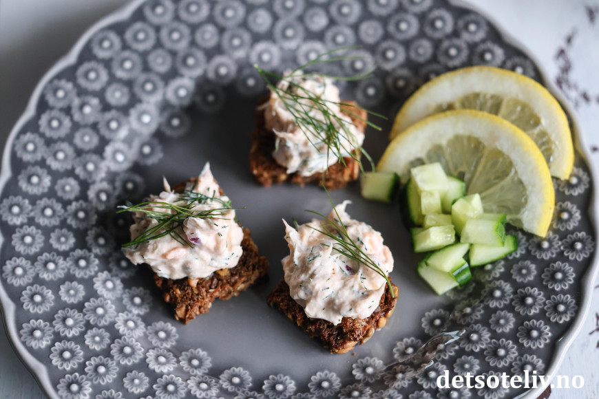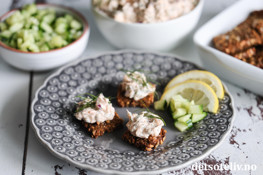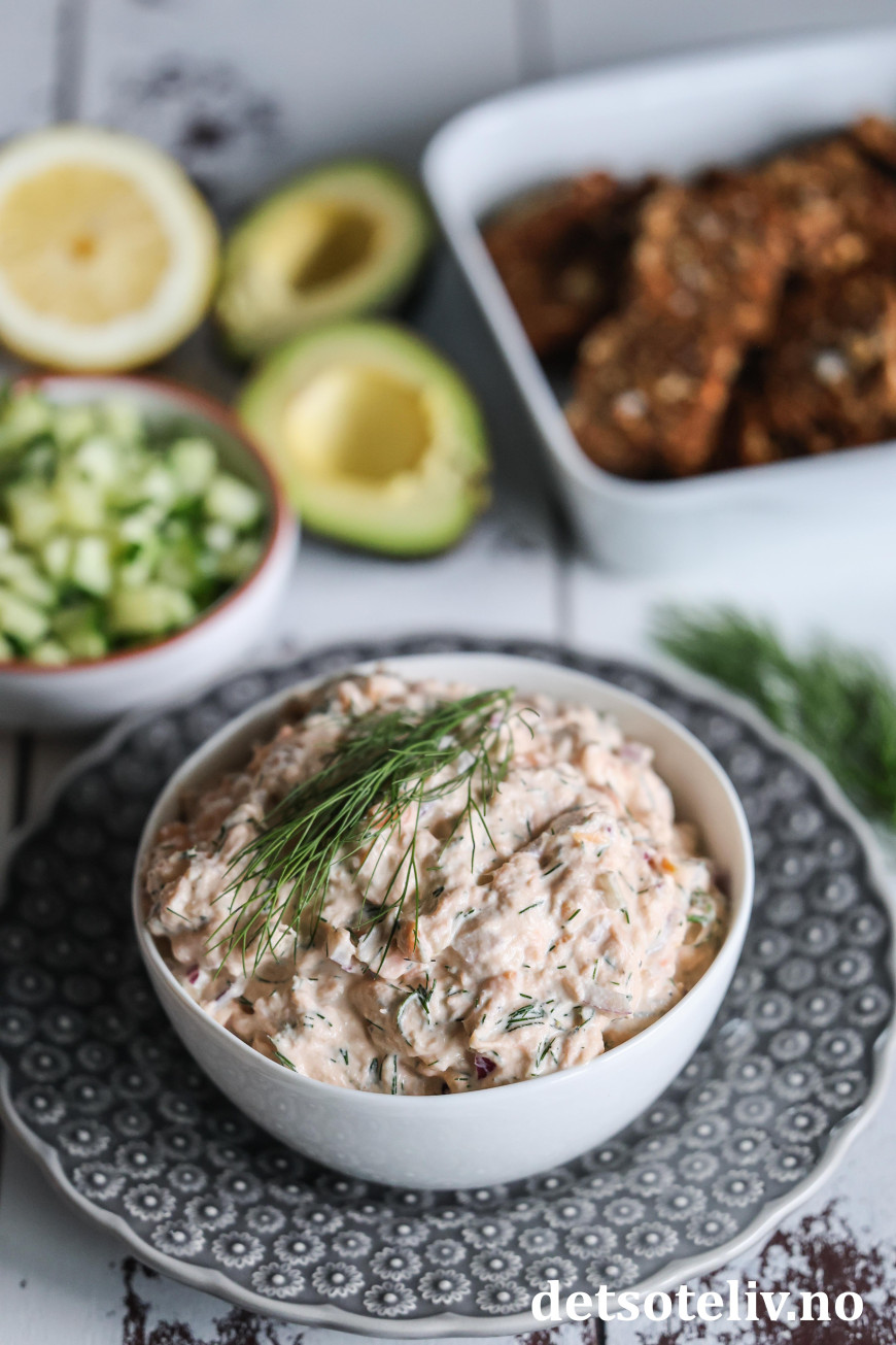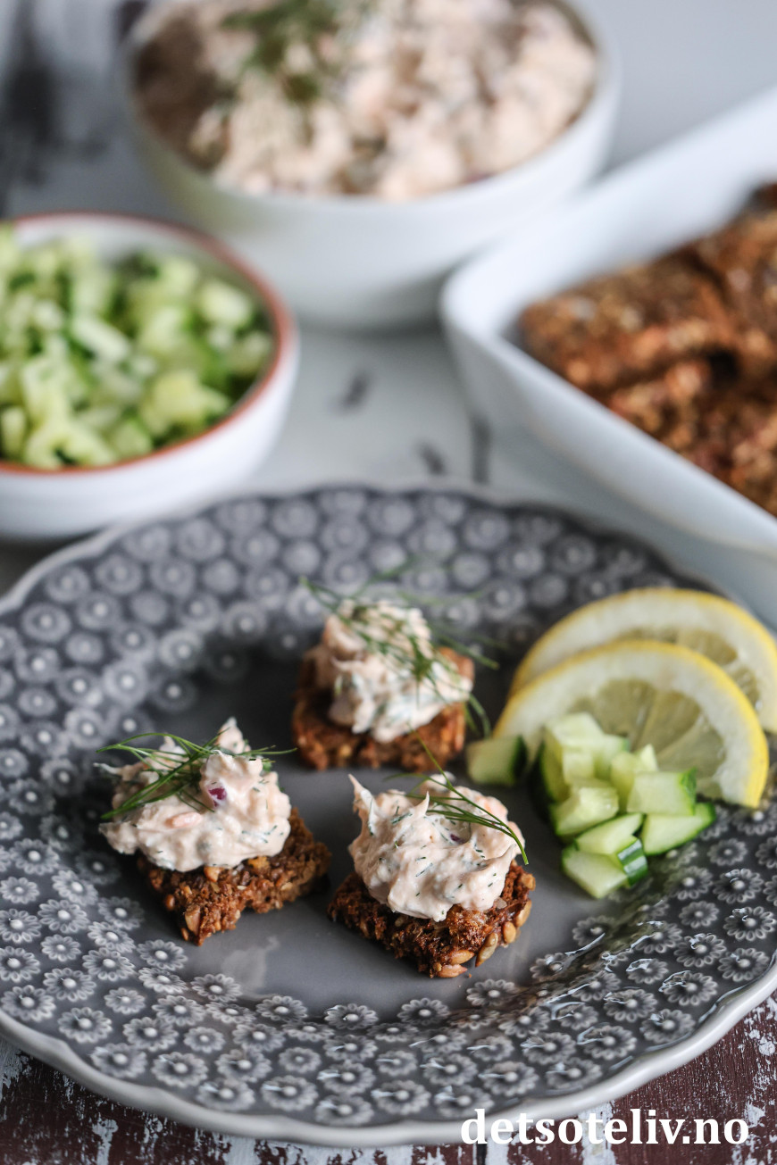 Server kuttet agurk, sitronbåter, avokadoskiver og rugbrødchips (eller andre salte kjeks) som tilbehør.
