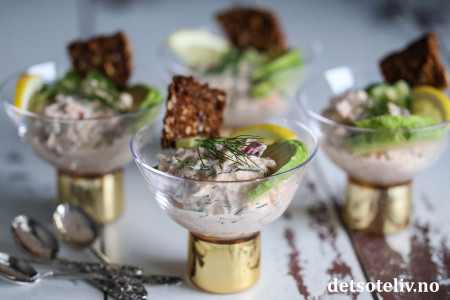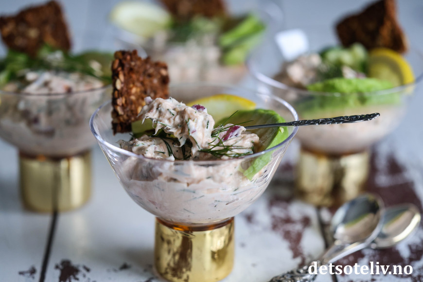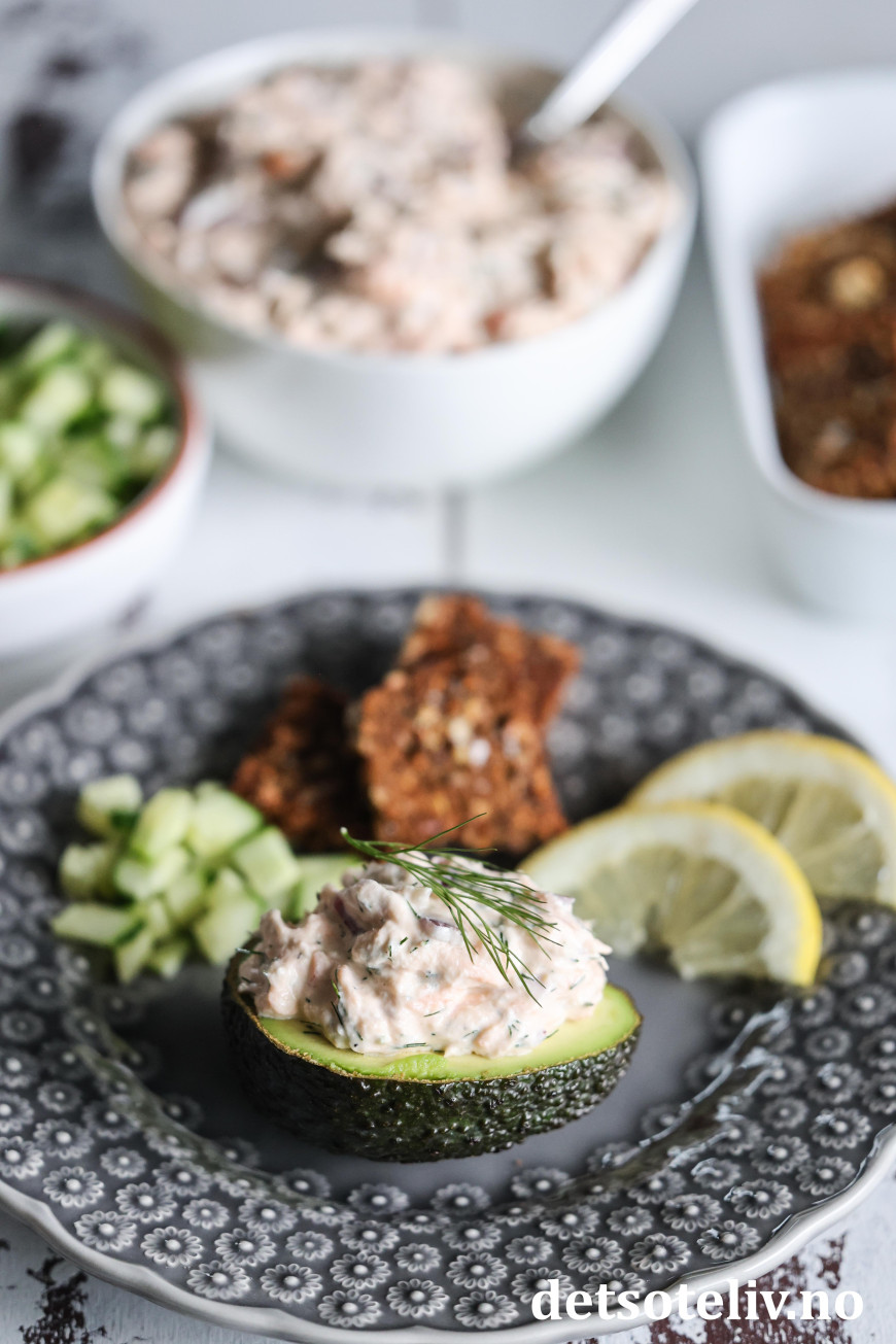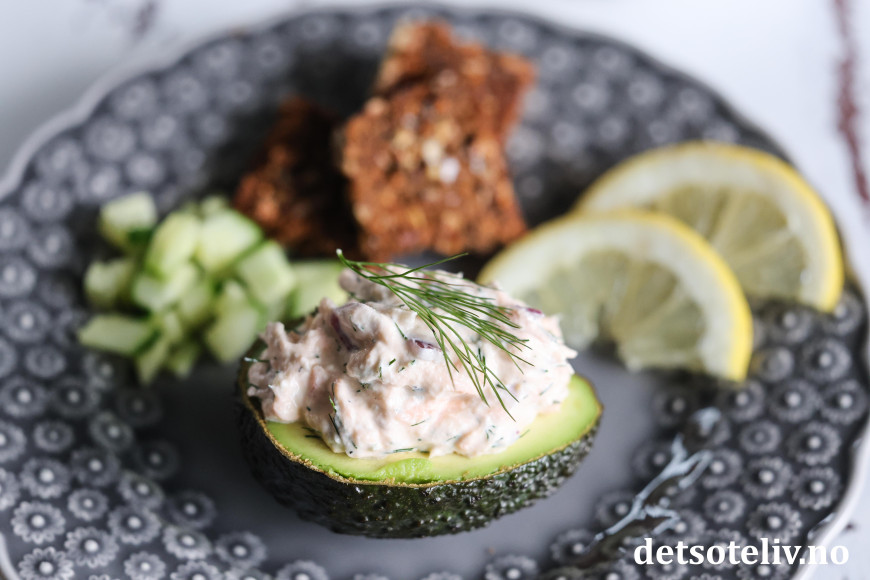 En populær forrett er å servere laksemousse i halve avokadoer.