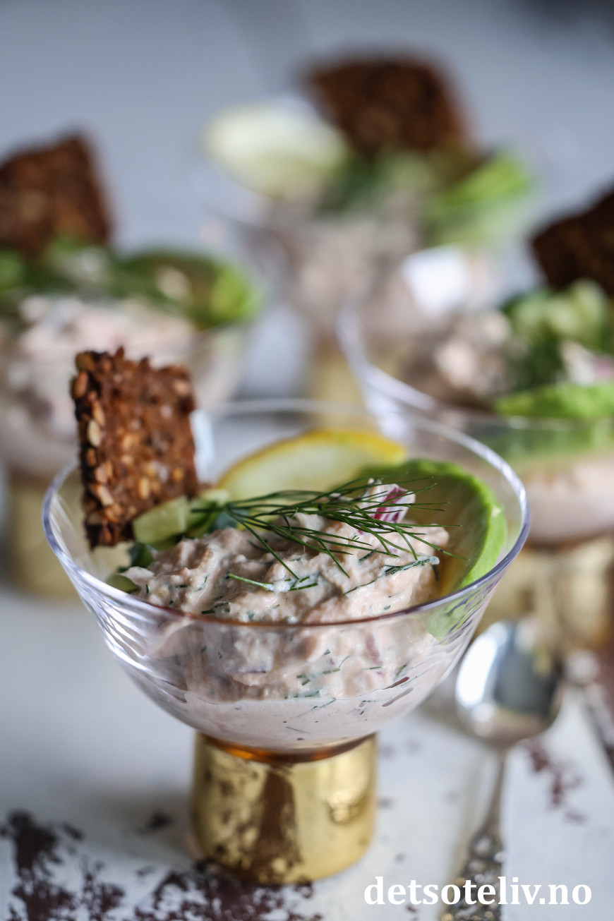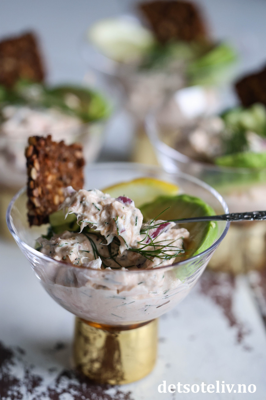 Eller ha laksemousse i pene glass. Pynt med små terninger agurk, avokadoskiver, sitronskive, frisk dill og rugbrødchips.