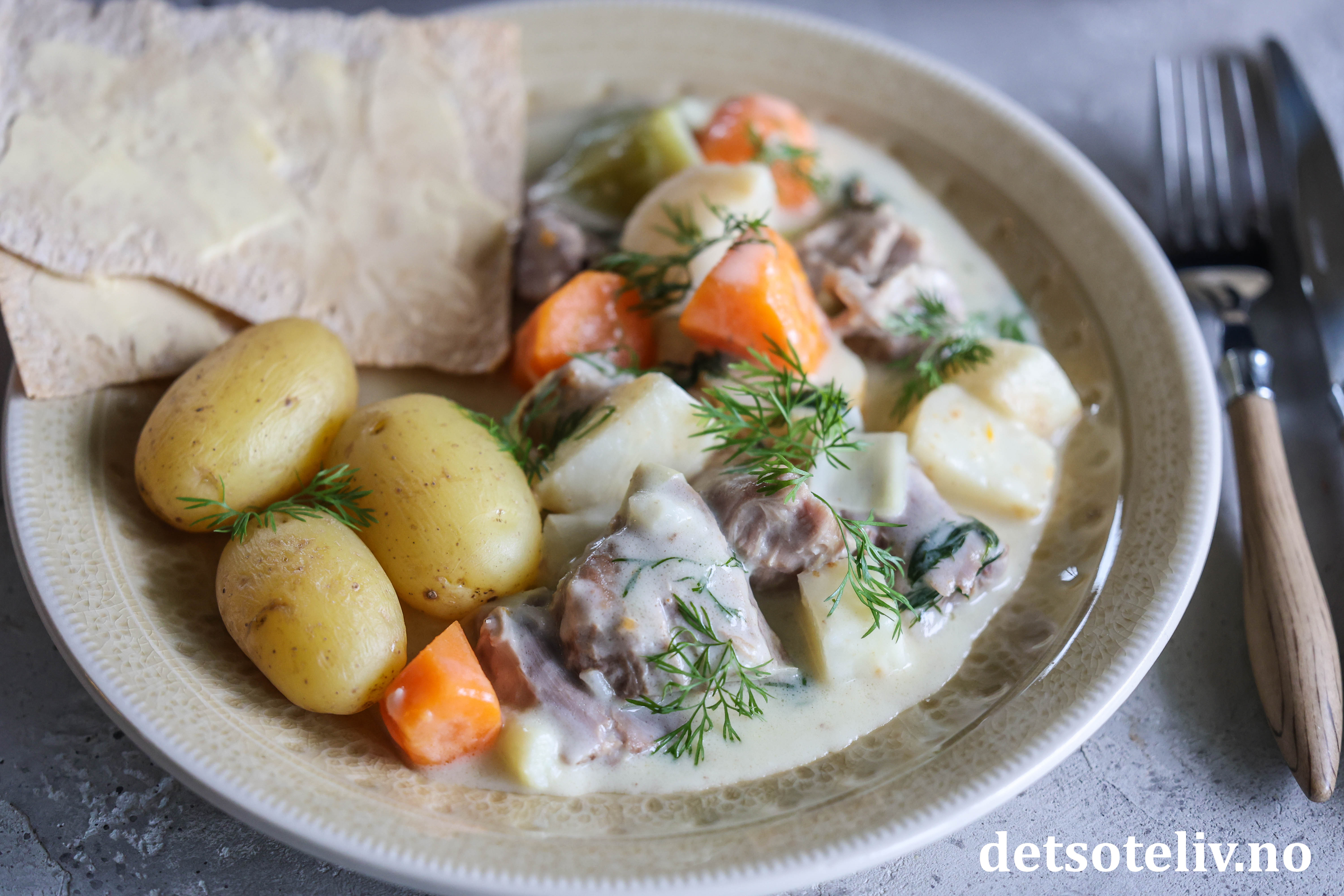 Sever lammegryten sammen med kokte poteter og flatbrød med smør.