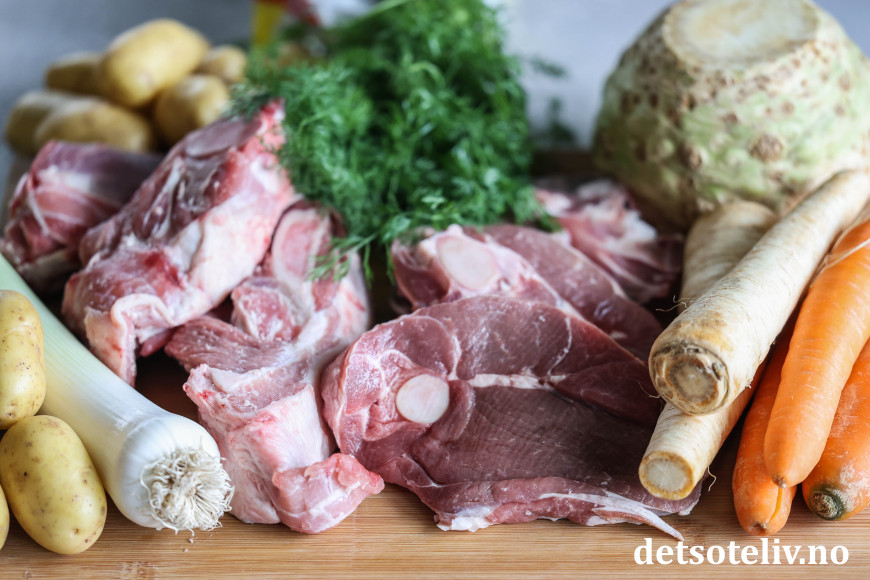 Ha lammekjøttet i en kjele. Kutt opp den øvre, grønne delen av purreløken og ha dette i kjelen (den hvite delen av purreløken brukes senere). Ha også salt og hele pepperkorn i kjelen. Hell på vann, men ikke mer enn at vannet akkurat dekker kjøttet (ca. 1,5 liter, se tips).