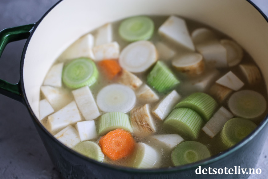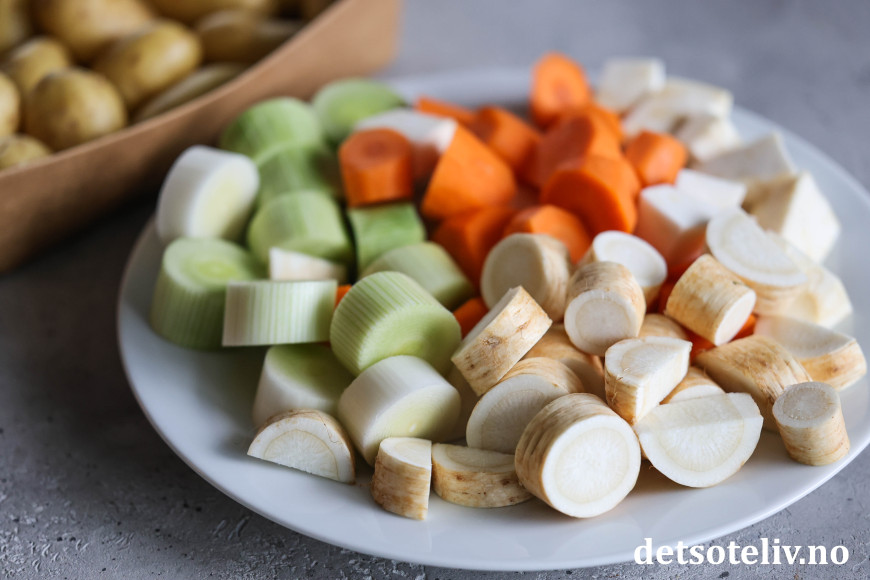 Rens grønnsakene (den hvite delen av purreløken, gulrøtter, sellerirot og persillerot), og del dem i omtrent like store biter.