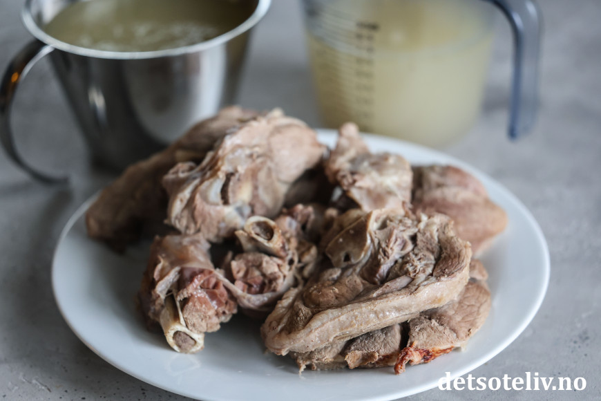 ♥ Det er viktig at kjøttet ikke koker for kraftig, for da vil det avgi væske og bli tørt. Bruk heller lavere varme og lengre tid. Kjøttet skal bare småputre i 2,5 time for at det skal bevare saftigheten mest mulig. Skum av underveis, for det som legger seg oppå vannet gir uklar kraft.