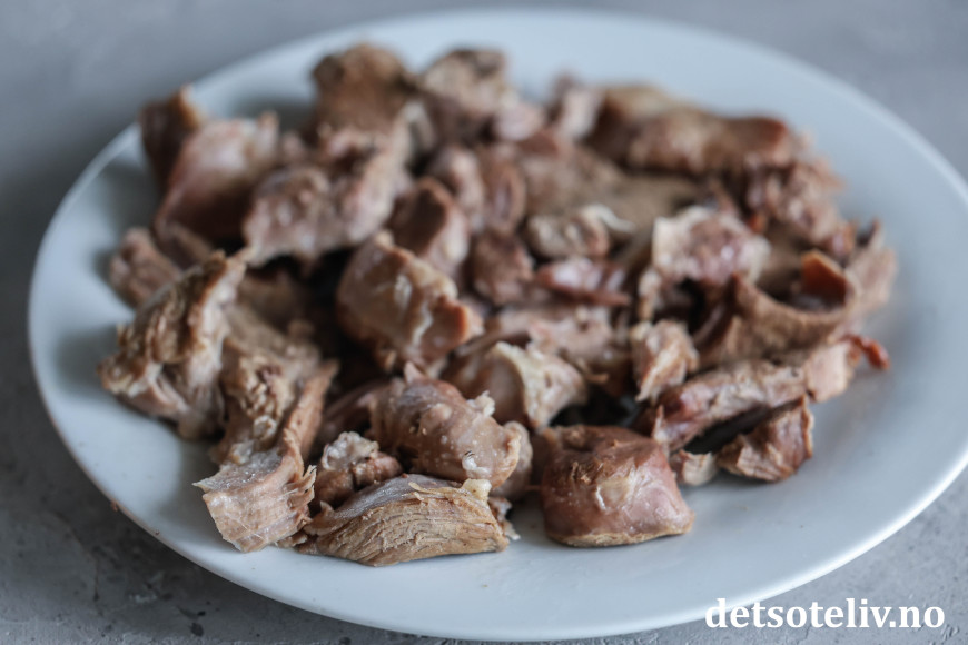 Løft kjøttstykkene ut av kjelen og over på en tallerken. La kjøttet avkjøle og rens det deretter med hendene så du får fine, store kjøttbiter. Dekk til kjøttet med folie slik at det ikke tørker ut mens du tilbereder resten.