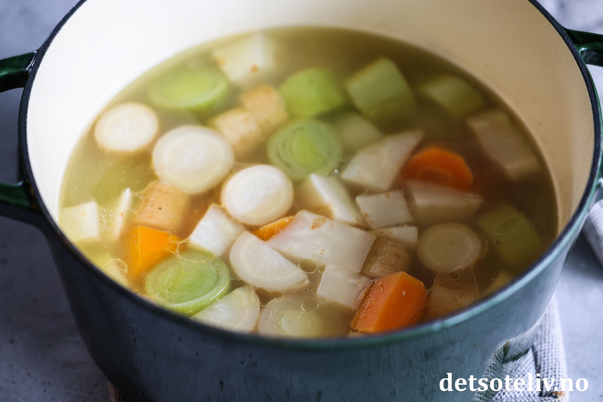 Sett kjelen tilbake på platen og la grønnsakene koke i kraften til de er så vidt møre.