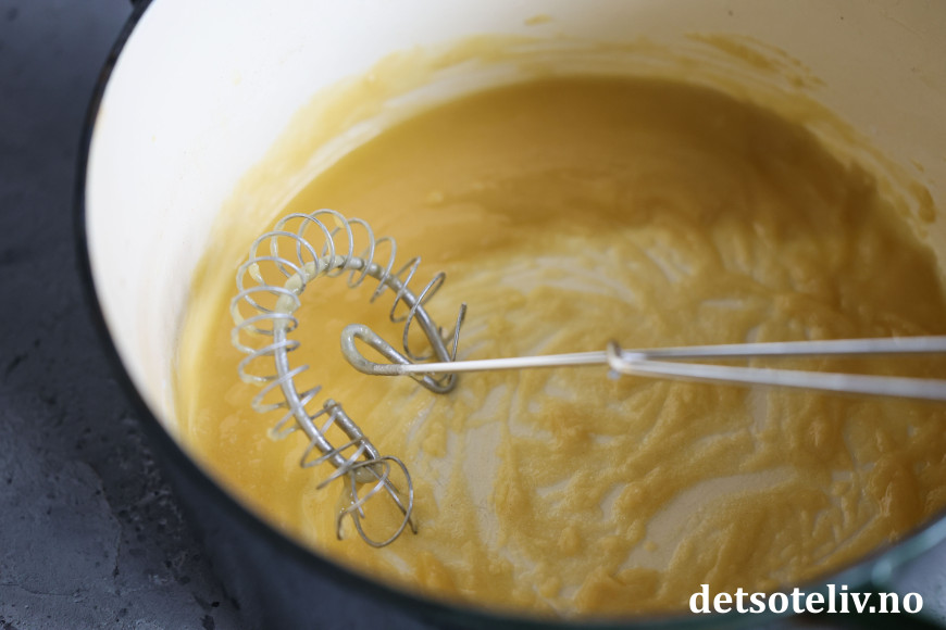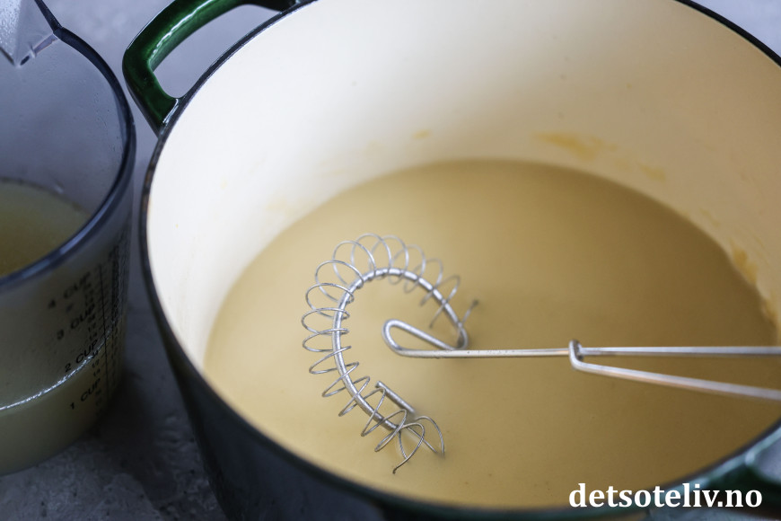 Vask kjelen og sett den tilbake på platen. Smelt smøret i kjelen og tilsett hvetemelet. Rør dette sammen til en jevning.