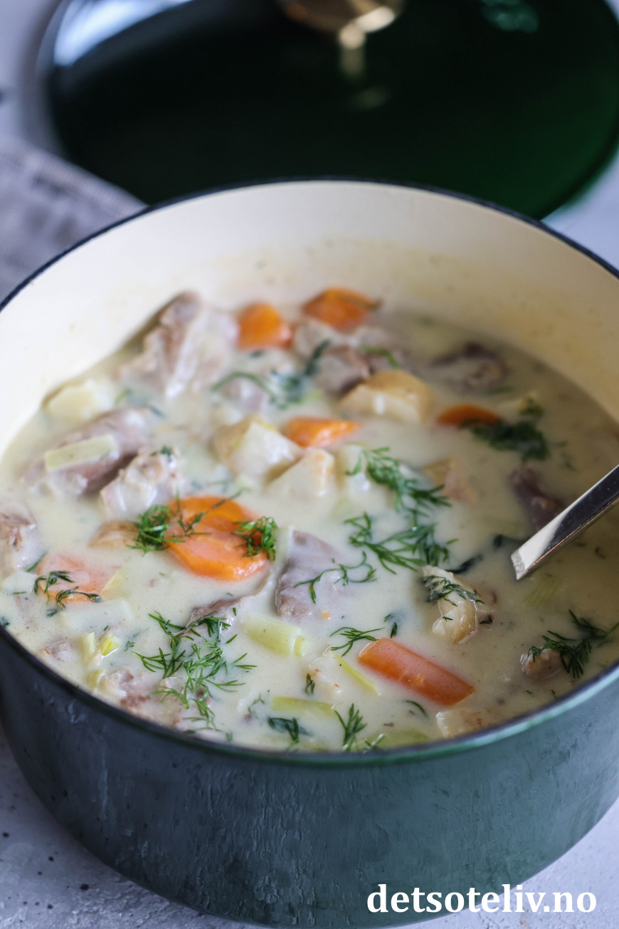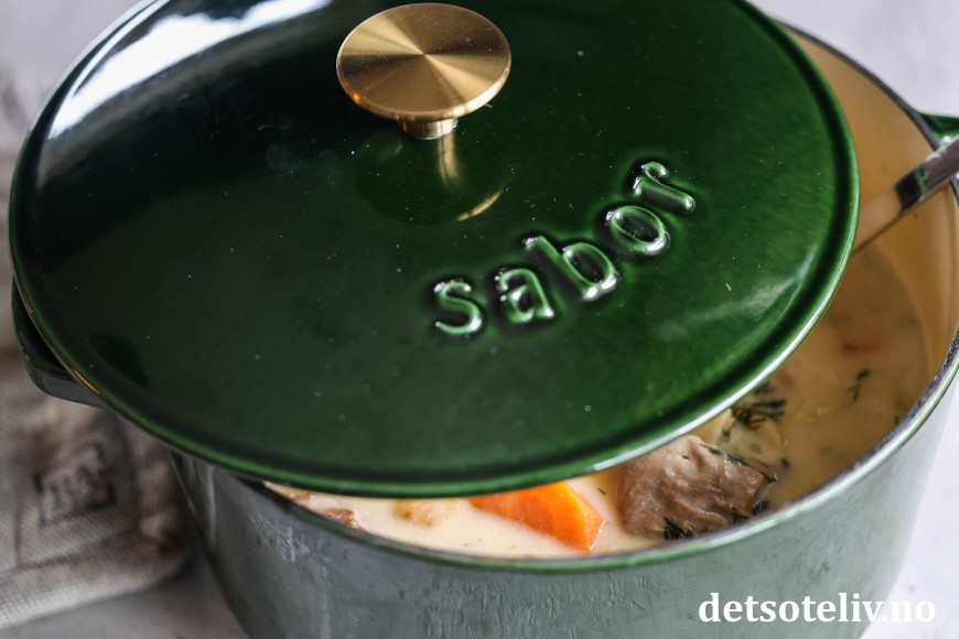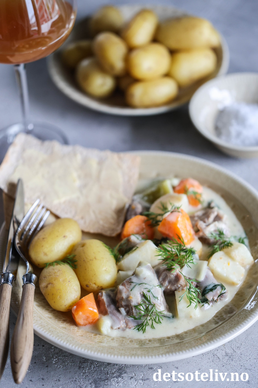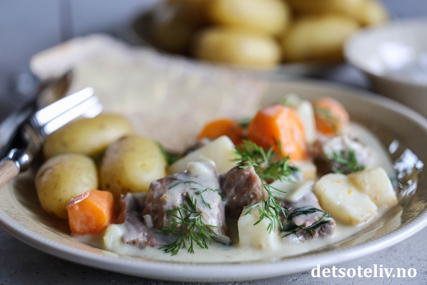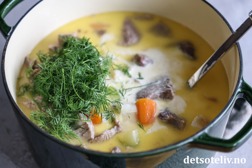 Legg kjøttbitene og de kokte grønnsakene i sausen. Tilsett kremfløten og masse frisk dill. Smak til med kvernet salt og hvit pepper. Vend rundt slik at alt i gryten blander seg, og varm opp på middels varme slik at gryten blir skikkelig gjennomvarm.