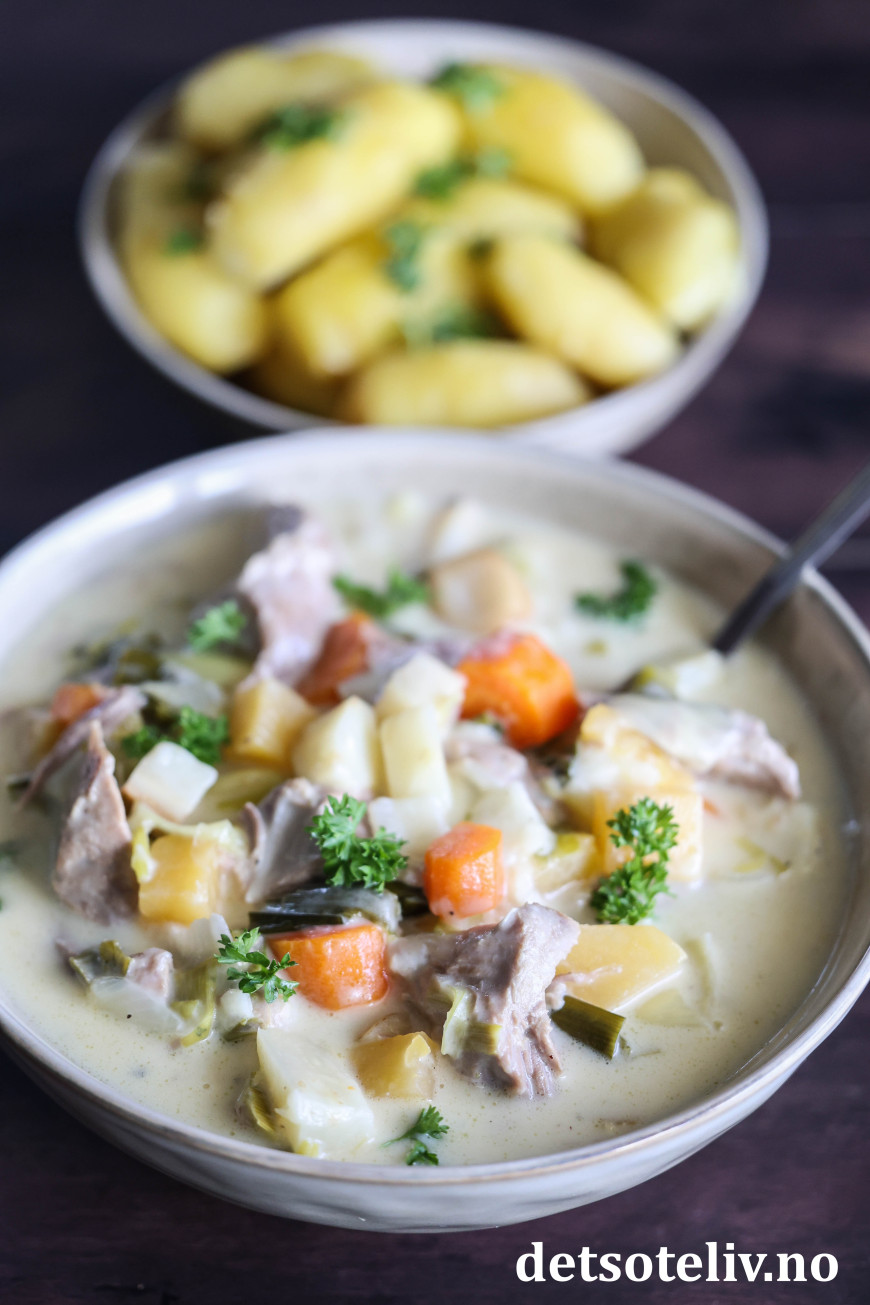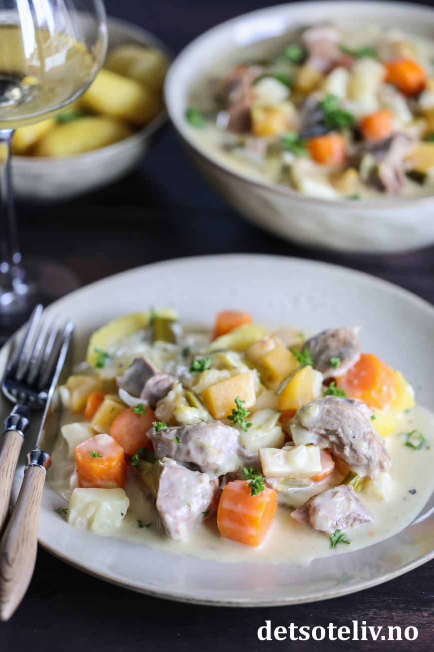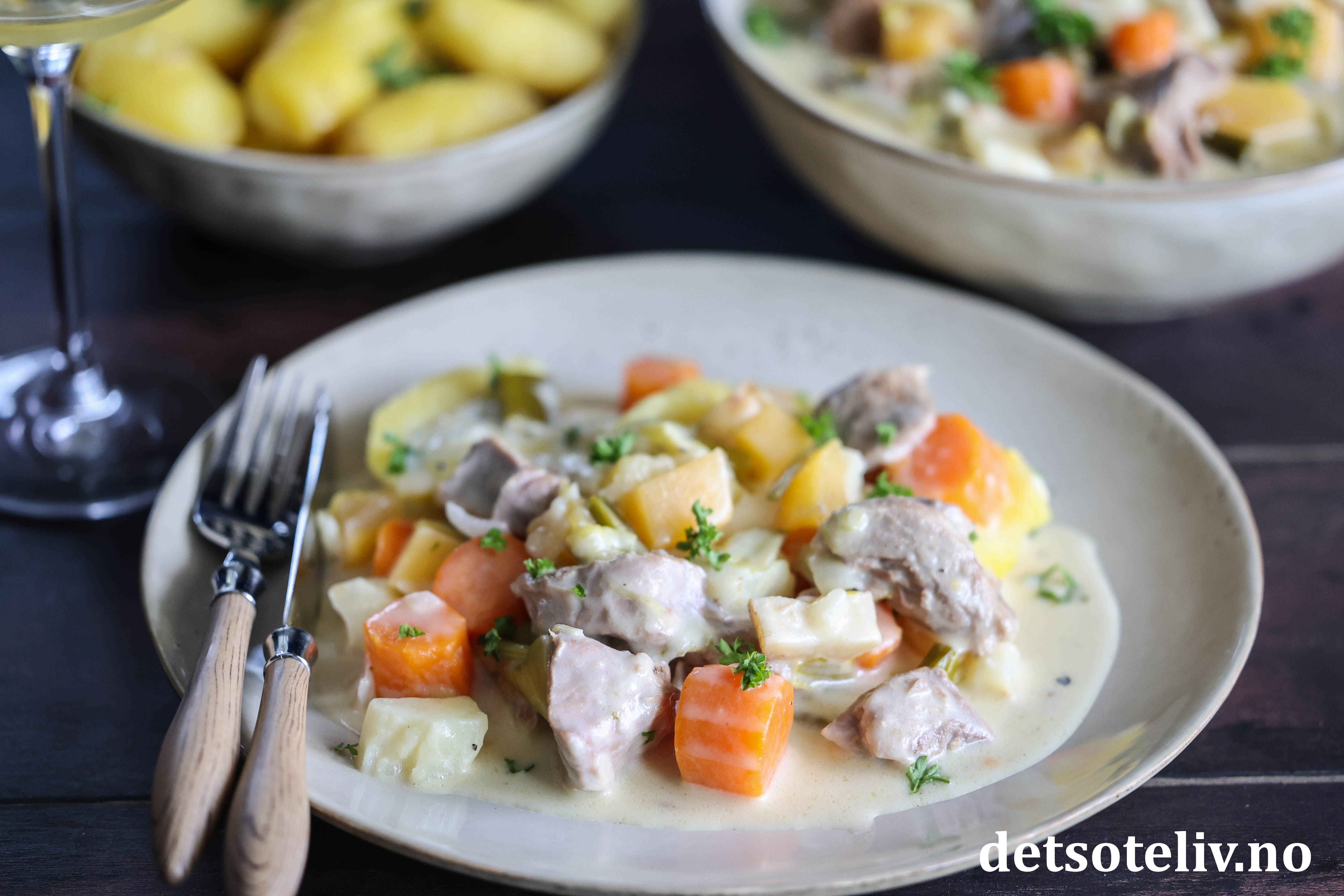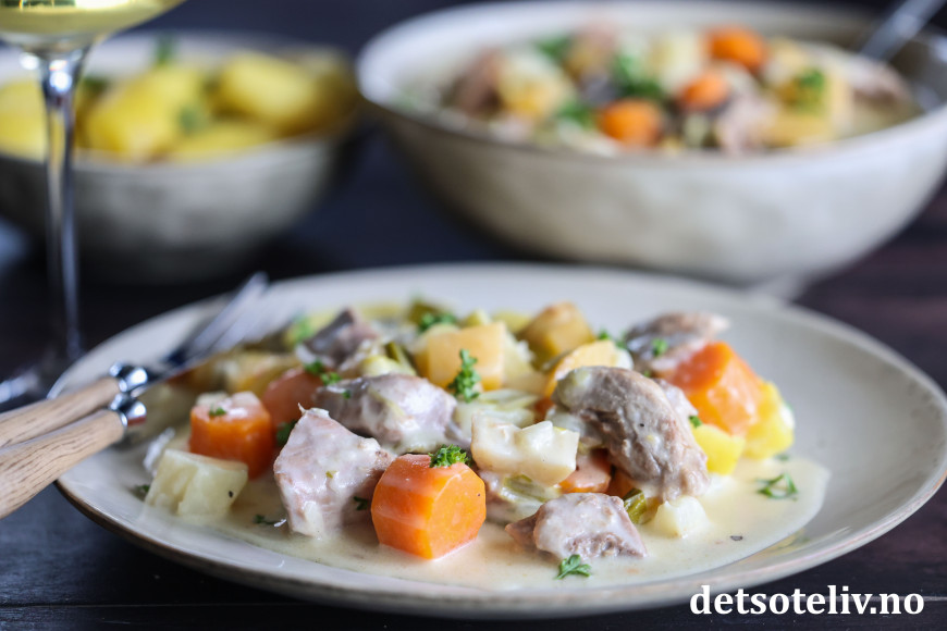 Lammefrikassé servert med kokte poteter er en kjempegod middag, som er spesielt populært å lage nå på høsten.