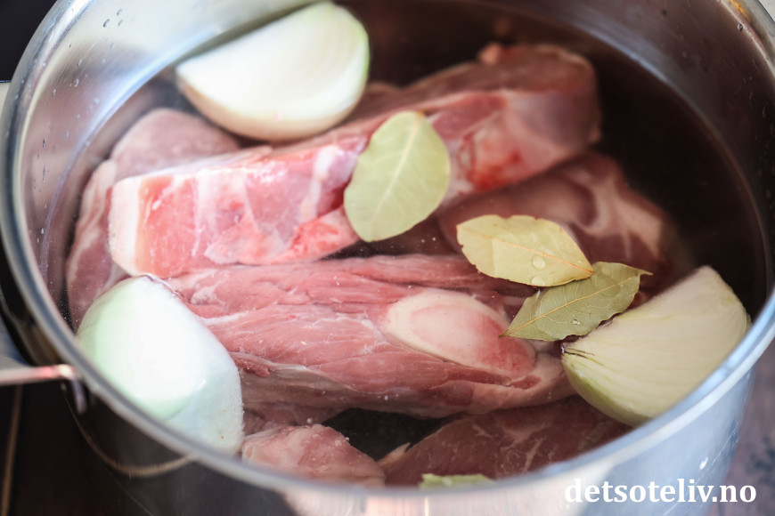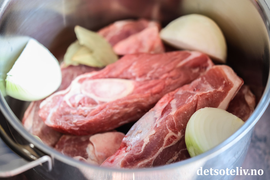 Ha lammekjøttet i en kjele sammen med løk, salt og laurbærblad.