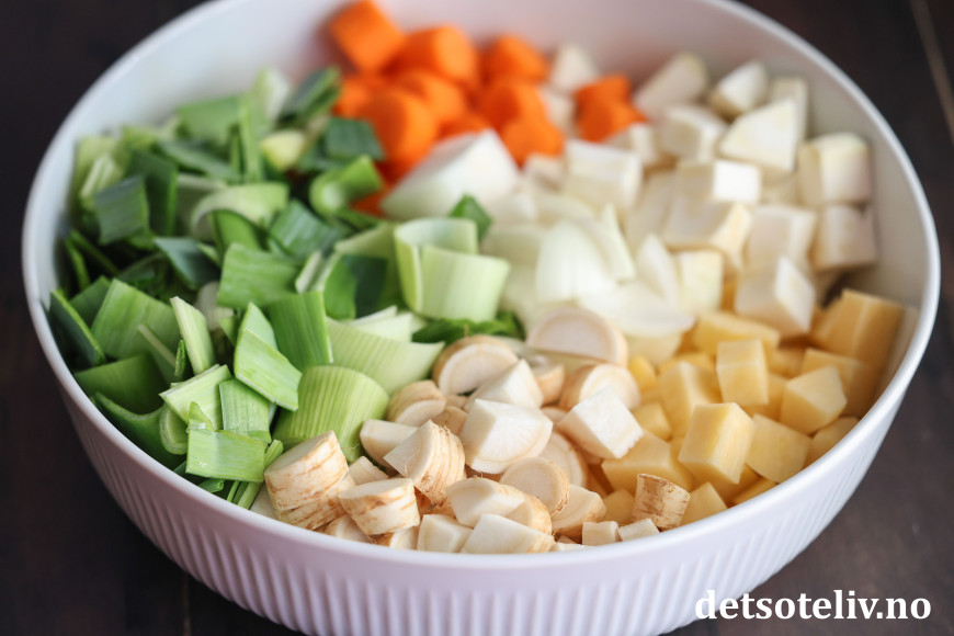 Rens grønnsakene og del dem i omtrent like store biter. Legg grønnsakene i kjelen med lammekraften. Sett kjelen tilbake på platen og la grønnsakene koke i kraften til de er så vidt møre.