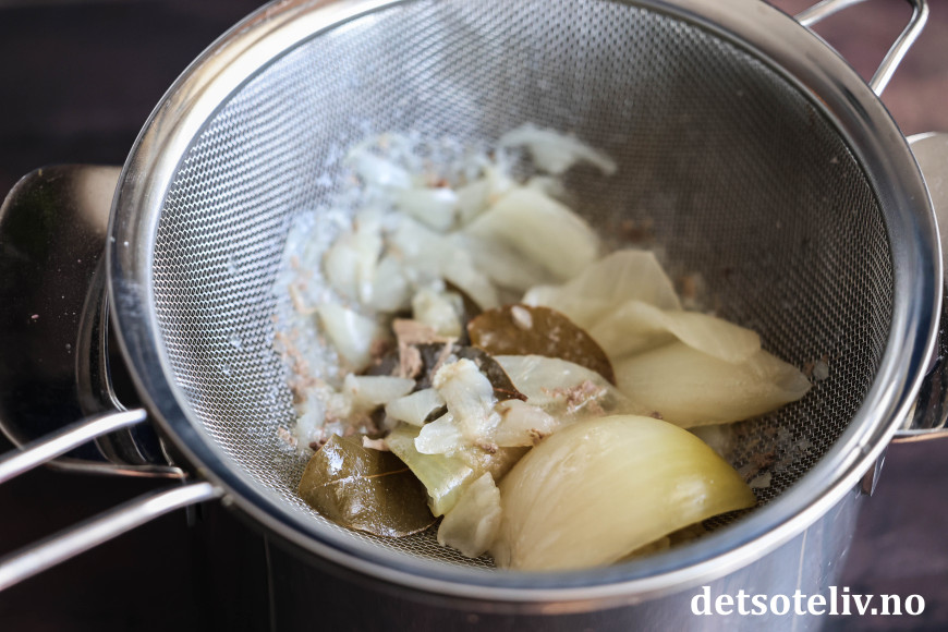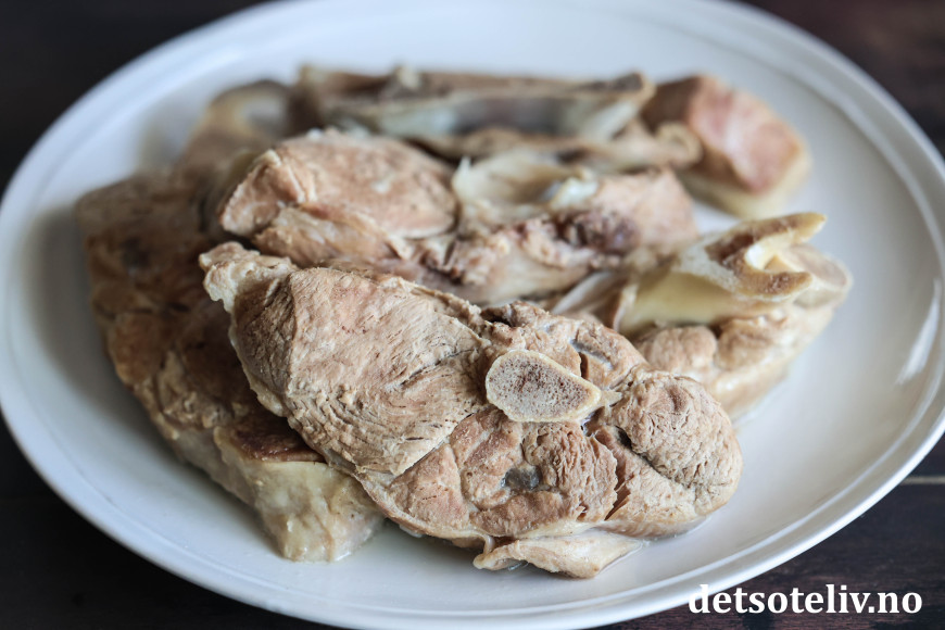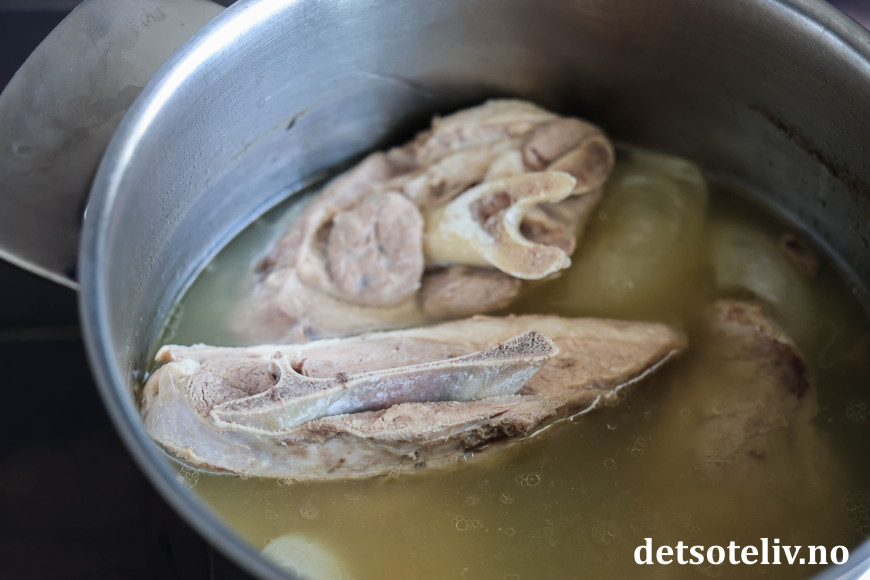 ♥ Ikke kok kjøttet i mer vann enn at det dekker kjøttet i kjelen. Det skal være maks 1,5 liter, men kan også være noe mindre. Dette fordi at det skal bli skikkelig god smak på kraften.