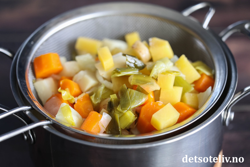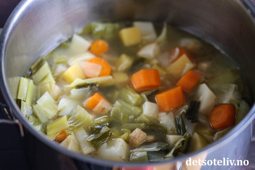 Sett kjelen tilbake på platen og la grønnsakene koke i kraften til de er så vidt møre.