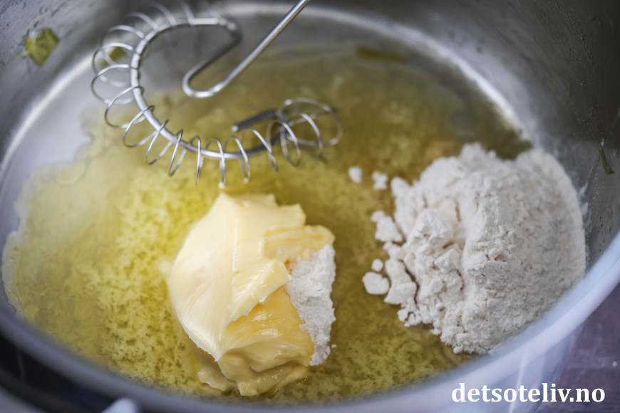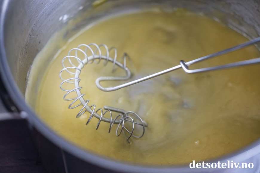 Vask kjelen og sett den tilbake på platen. Smelt smøret i kjelen og tilsett hvetemelet.