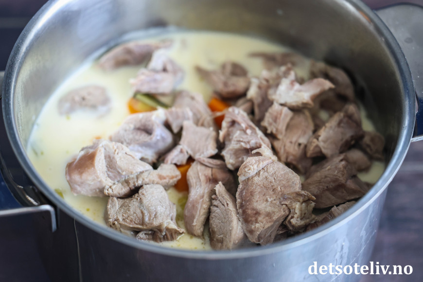 Sett kjelen på platen med lokk på, og varm opp til kokepunktet. Skru så ned varmen på platen og la kjøttet småputre under lokk i ca. 2,5 timer, til det blir skikkelig mørt. Fjern skummet som legger seg på oppå vannet underveis i kokingen. Pass på varmen slik at det ikke begynner å koke for kraftig i kjelen, kjøttet skal bare småkoke og trekke (se tips).