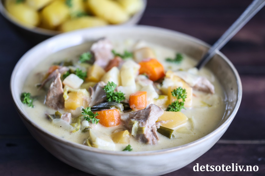 Hønse- eller kyllingfrikassé er kanskje den mest kjente varianten, men i Norge har det også vært veldig vanlig å bruke lammekjøtt.