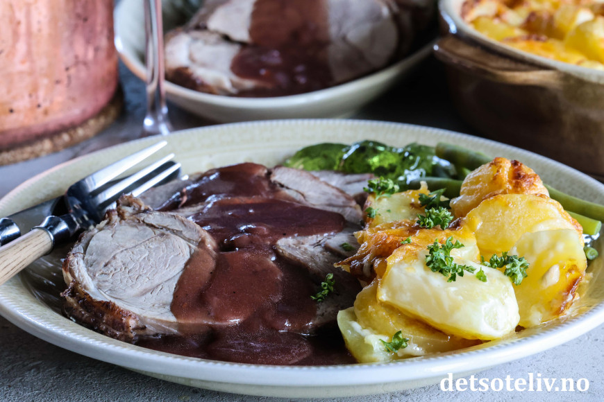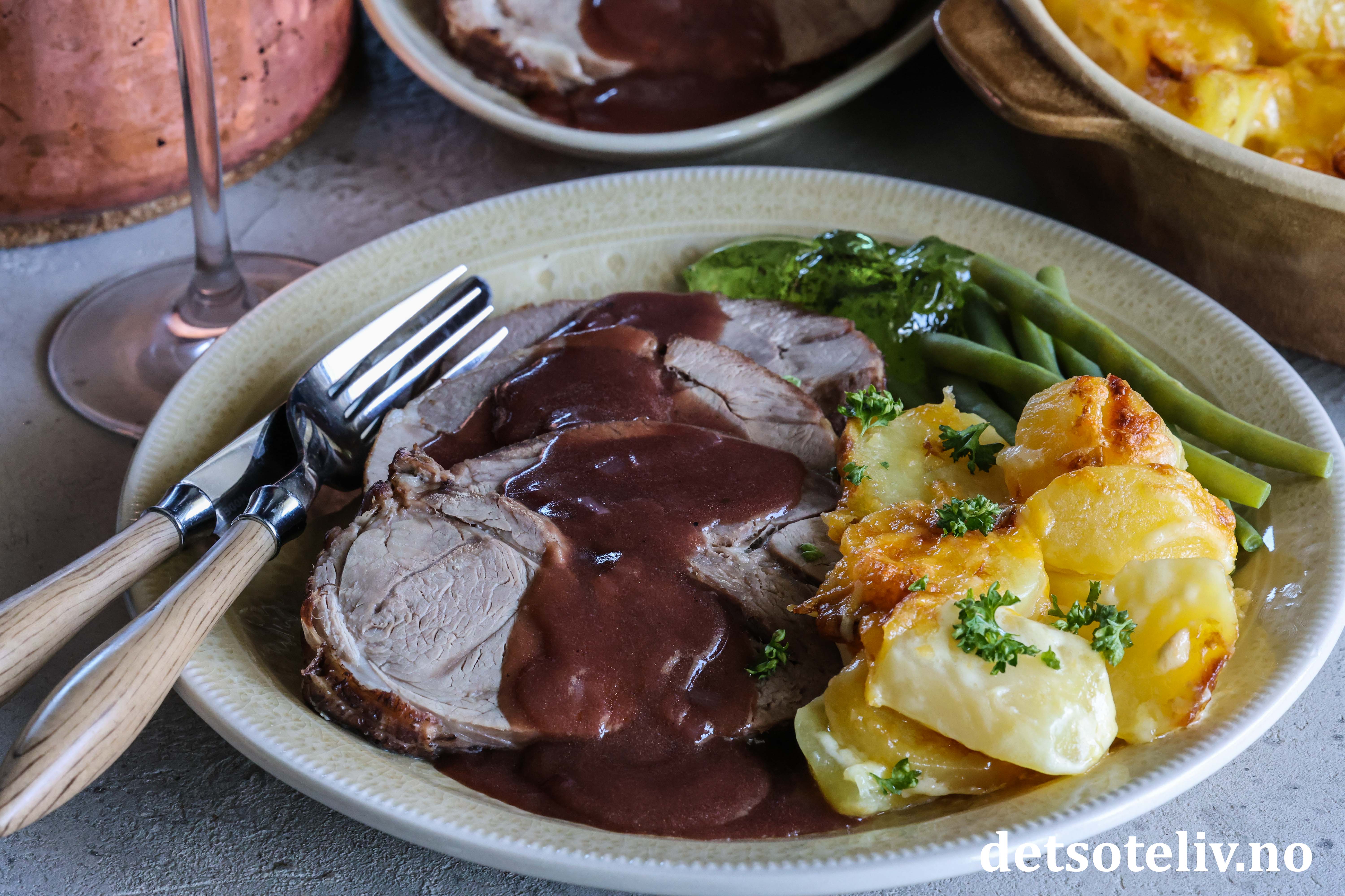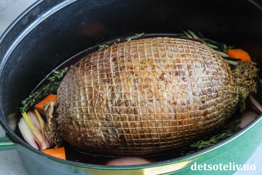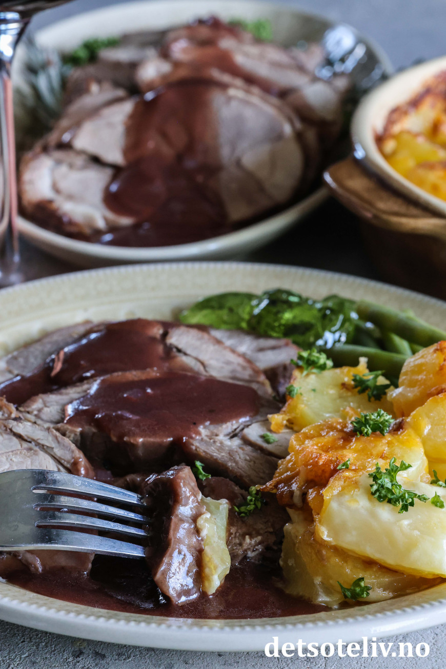Lammekjøttet blir saftig og veldig smakfullt, og i gryten samler det seg en nydelig kraft som kan brukes i sausen.