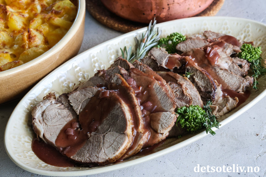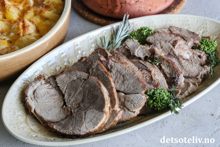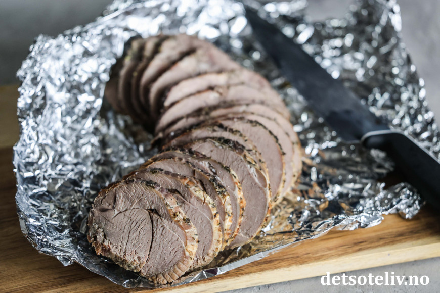 ♥ Hvis du ønsker å skjære lammesteken i helt tynne skiver, kan du steke den dagen i forveien, pakke den inn i folie og oppbevare i kjøleskapet. Dagen etter vil lammesteken være såpass fast at den er lett å skjære i tynne skiver. Varm opp kjøttet i stekeovnen innpakket i folie slik at kjøttet holder seg saftig.