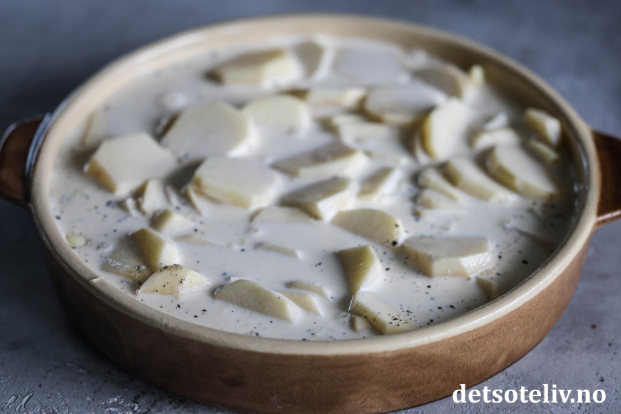 Skrell potetene og skjær dem i skiver. Ha potetene i en smurt, ildfast form (27 cm i diameter eller på størrelse med liten langpanne 20 x 30 cm). Skjær hvitløksfedd i mindre biter og fordel over potetene.