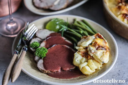 Lammesteken serveres her med en klassisk Rødvinssaus, Fløtegratinerte poteter med hvitløk og ost, aspargesbønner og hjemmelaget Myntegelé.