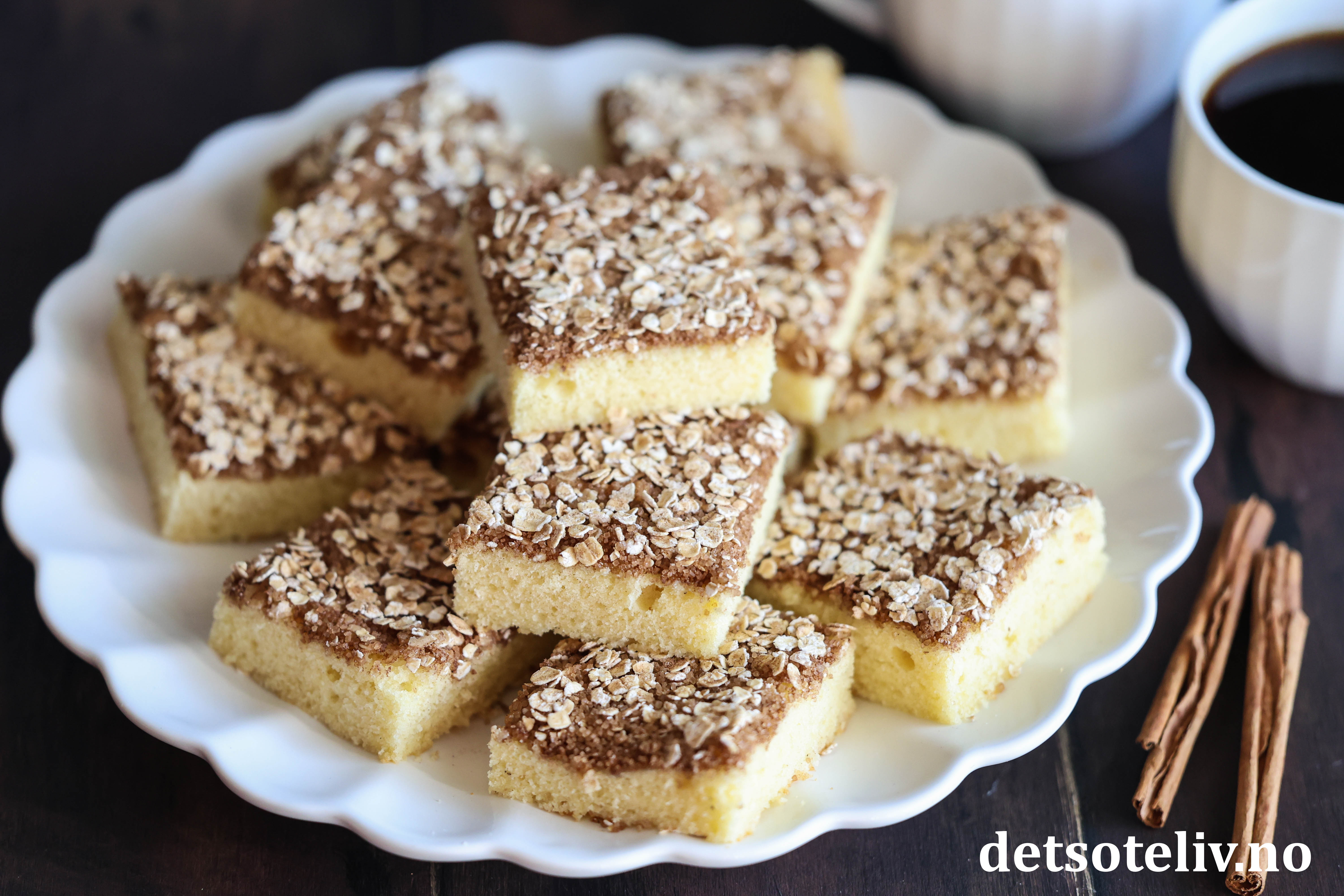 Fordel deigen utover i en stor, bakepapirkledd langpanne (ca 30 x 40 cm). Bland havregryn med brunt sukker og kanel. Strø havreblandingen jevnt over kaken.