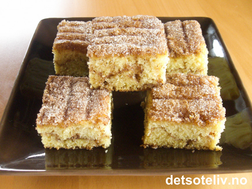 Ha halvparten av deigen i en stor, bakepapirkledd langpanne (ca 30x40 cm). Bland sukker og kanel og dryss halvparten av blandingen over deigen i langpannen. Fordel resten av deigen over i et jevnt lag. Dryss over resten av sukker- og kanelblandingen.