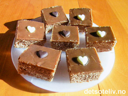 La glasuren stå i kjøleskapet til den har passe smørekonsistens. Bre den så over kaken med en smørekniv og la kaken stå i romtemperatur til glasuren har stivnet litt. Del kaken opp i firkanter og pynt eventuelt hver bit med et sjokoladehjerte.