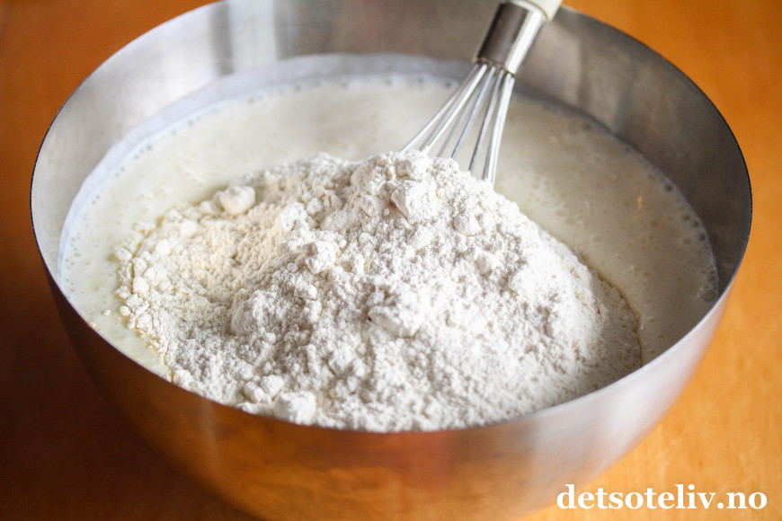 Ha surmelken i en stor rørebolle. Bland i sukker, egget, vanilje og natron og ha deretter i hvetemelet.