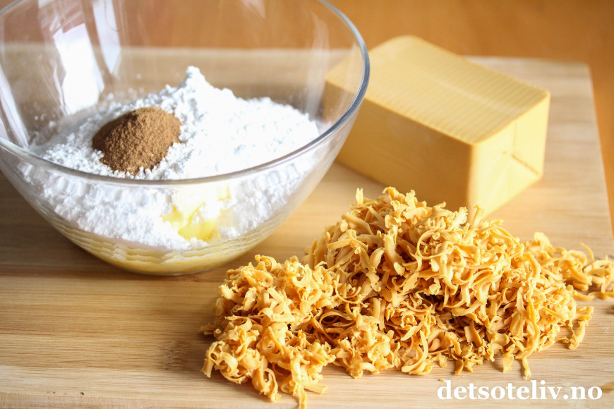 Riv brunosten på rivjern og tilsett. Pisk videre så brunosten blander seg godt med smørkremen.